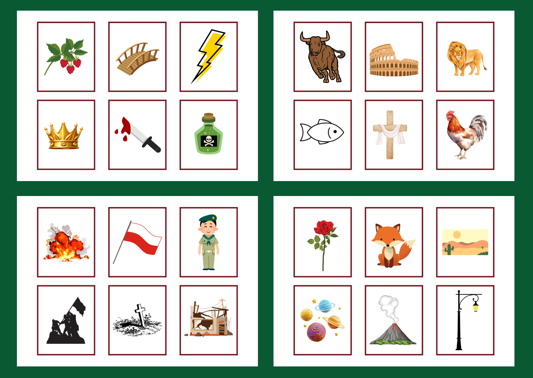 Materiał składa się z 17 kartek w formacie A4 z obrazkami kojarzącymi się z lekturami omawianymi w klasach 4-8 (na każdej kartce znajduje się 6 fiszek). Można je wykorzystać na wiele sposobów, np. podczas pracy indywidualnej lub grupowej, fiszki można rozdać lub losować. Zadaniem uczniów jest podanie tytułu i autora lektury, z którą można skojarzyć obrazek oraz uzasadnienie jego związku z lekturą.
