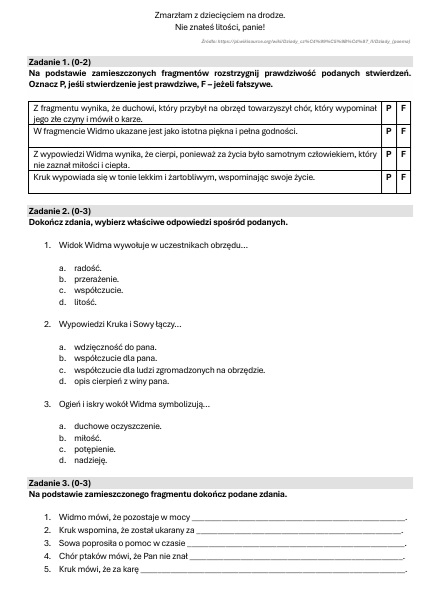 -Pytania z treści i problematyki lektury – sprawdzają znajomość fabuły, motywów i przesłania utworu.