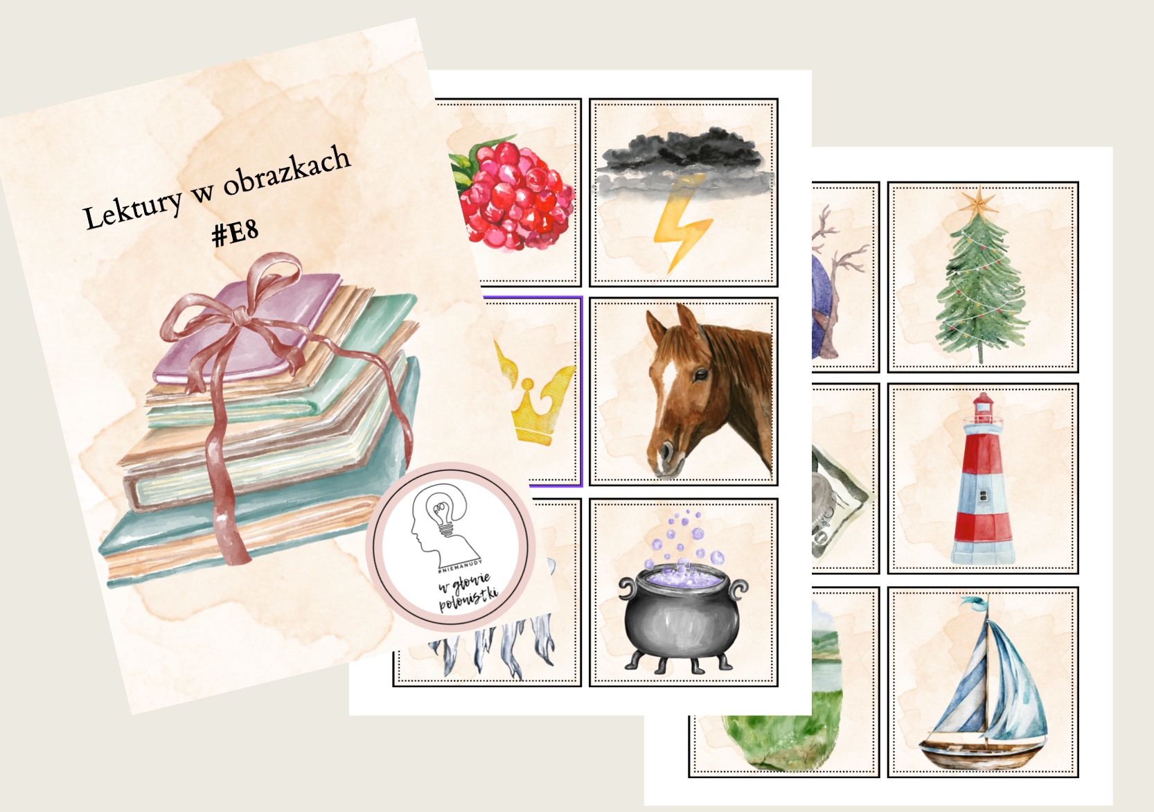 Lektury w obrazkach to świetna opcja powtórkowa przed egzaminem ósmoklasisty. Wystarczy zalaminować obrazki, rozłożyć je na ławce i pozwolić, aby każdy mógł wybrać dowolną grafikę.