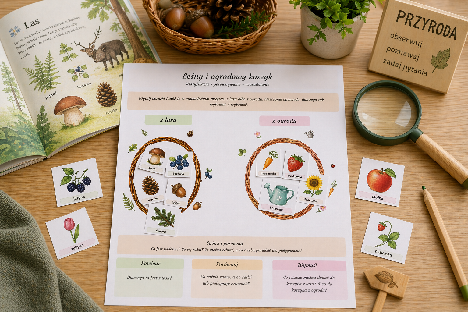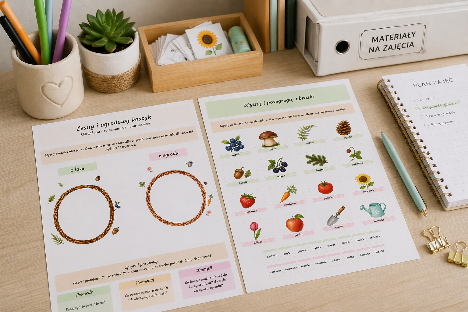Uczniowie wycinają ilustracje i klasyfikują je do dwóch koszyków: z lasu 🌲 oraz z ogrodu 🌷. To jednak dopiero początek! Zadanie angażuje nie tylko ręce, ale przede wszystkim głowę – dzieci porównują, uzasadniają i wyciągają wnioski.