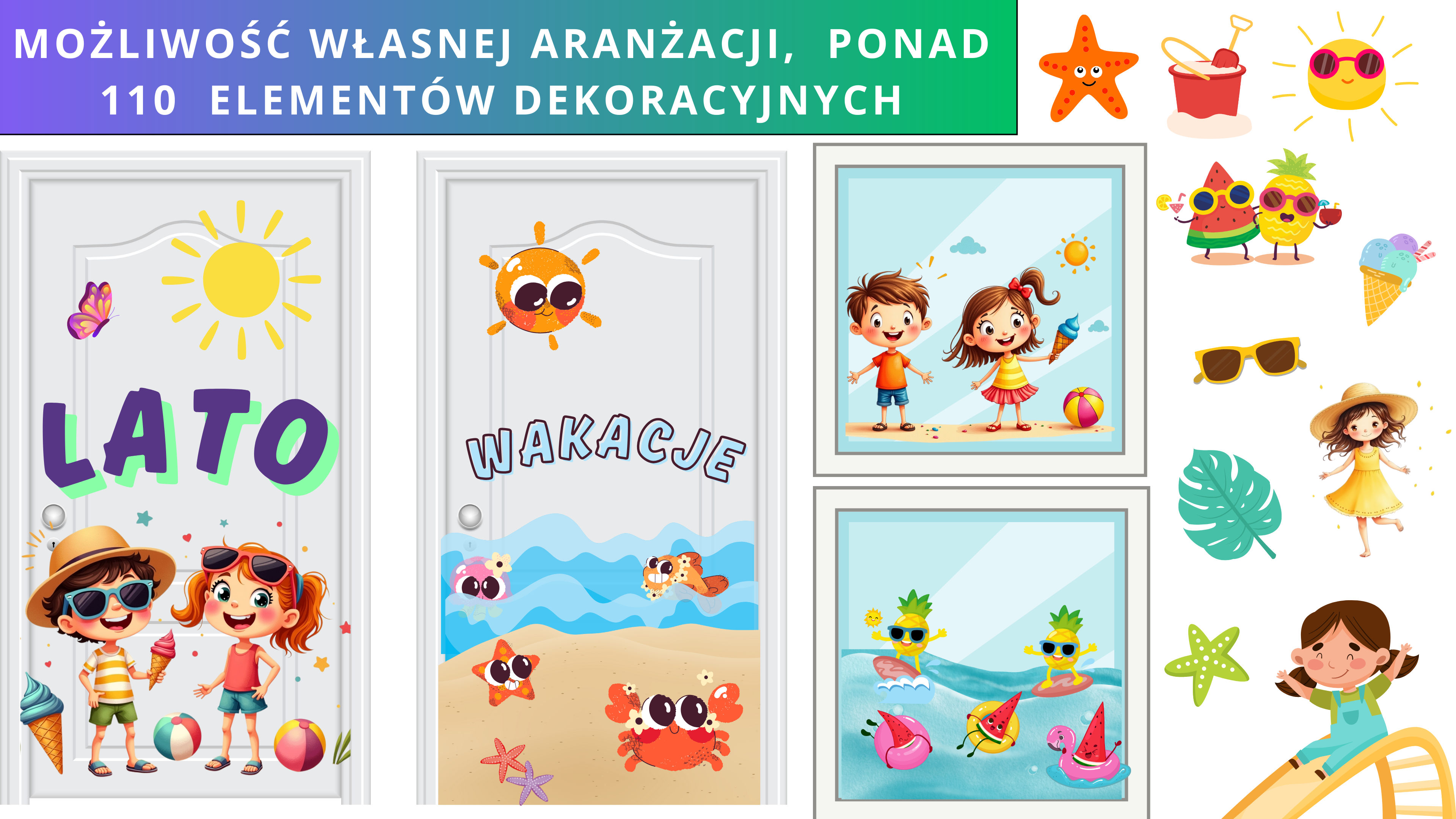 Szukasz wyjątkowej dekoracji na gazetkę, okno lub drzwi z okazji lata i zbliżających się wakacji? 🌞 Mam coś idealnego dla Ciebie! Kolorowy zestaw letnich ozdób zawiera ponad 110 elementów do samodzielnego druku – wesołe, dziecięce grafiki, które wprowadzą słoneczną atmosferę do każdej sali.