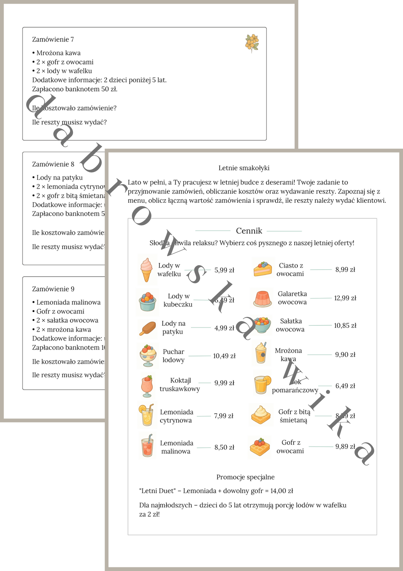 Uczniowie wcielają się w rolę pracowników letniej budki z deserami – przyjmują zamówienia, korzystają z cennika, uwzględniają specjalne promocje i obliczają należności oraz resztę.