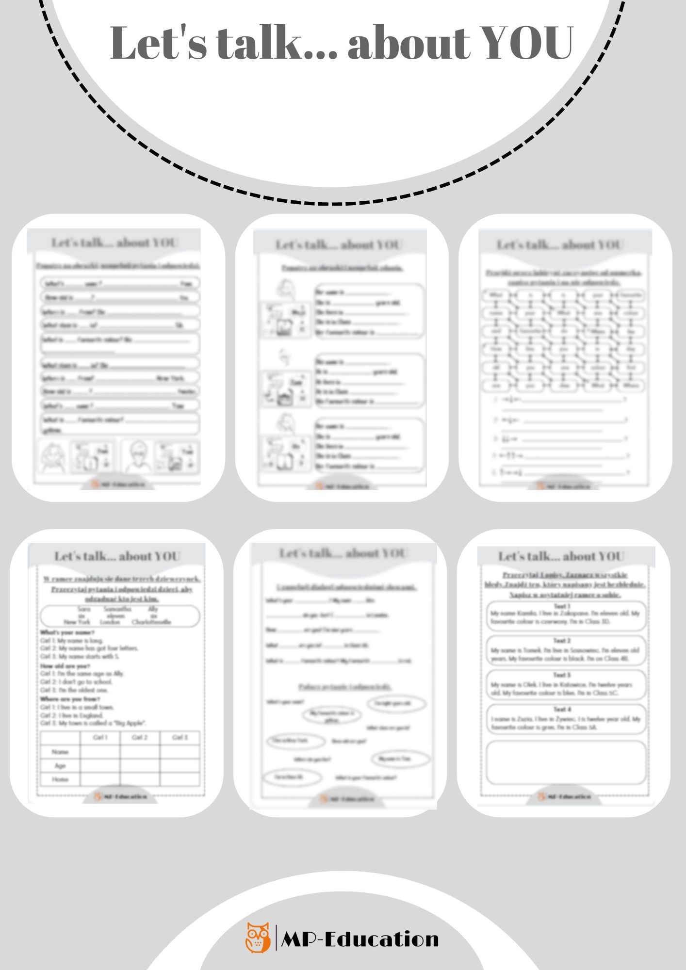 Let's talk... about you - Nauka podstawowych pytań w języku angielskim i przedstawiania się to zestaw składający się z 22 kart pracy, na których poznajemy 5 podstawowych pytań i uczymy się na nie odpowiadać. Zadania skonstruowane są tak, aby miały różny poziom trudności, są zarówno brakujące wyrazy, dopasowywanie pytań do odpowiedzi, a także wąż wyrazowy lub labirynt.