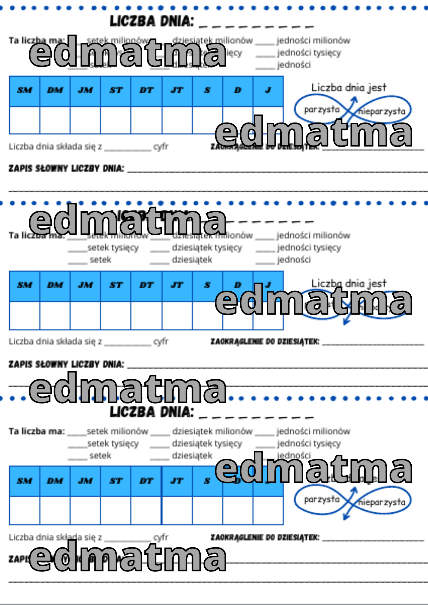Każda kartka to inna wersja karteczki - aby móc używać ich zarówno na początku lekcji z działu systemu dziesiątkowego, jak i później przy większym zaawansowaniu osób w klasie. Dlatego najmniejsza liczba dnia ma tylko 3 cyfry, a największa aż 9. Więc mamy aż 6 różnych wersji liczby dnia!