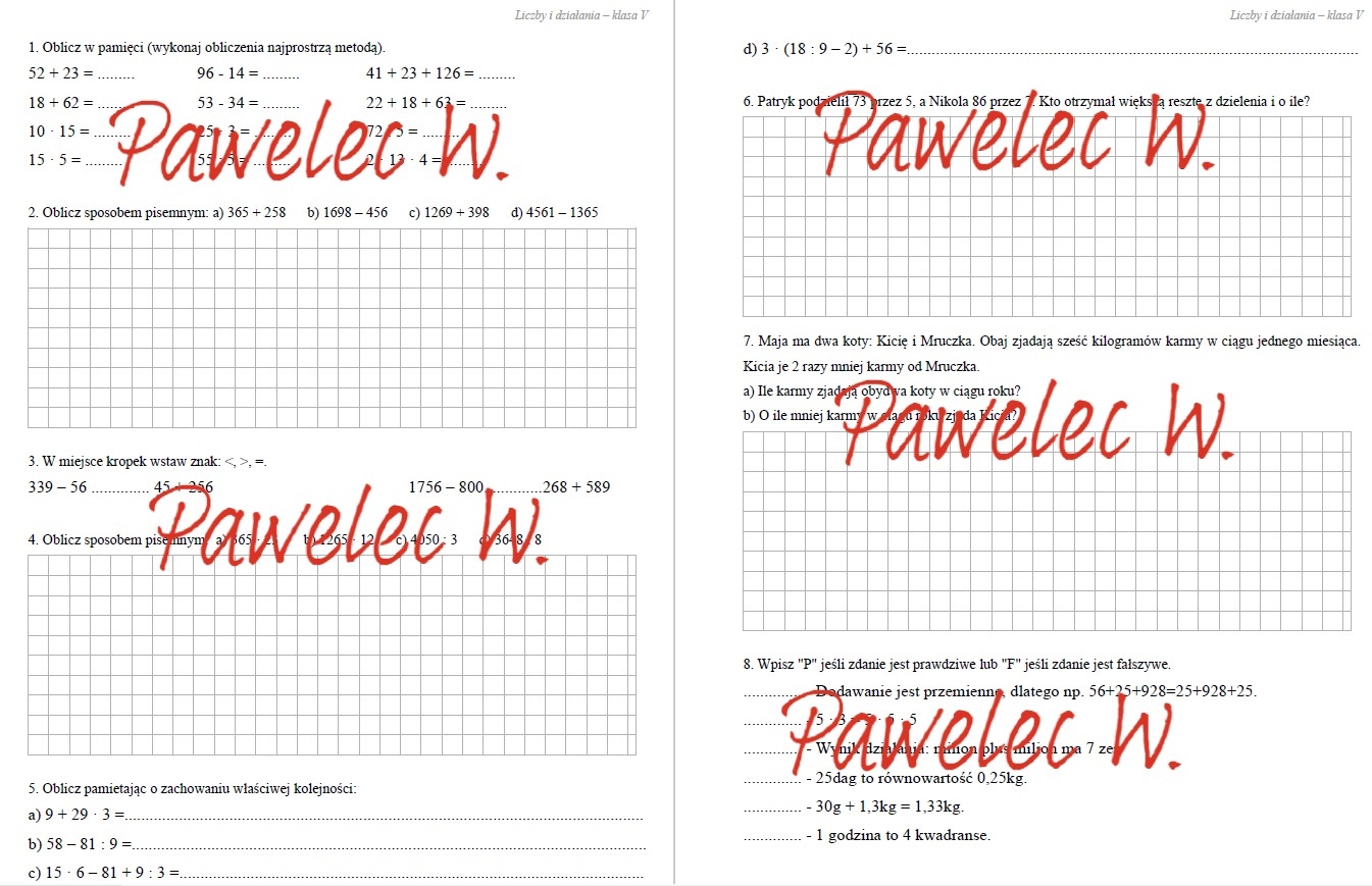 Sprawdzian z działu Liczby i działania dla klasy 5.