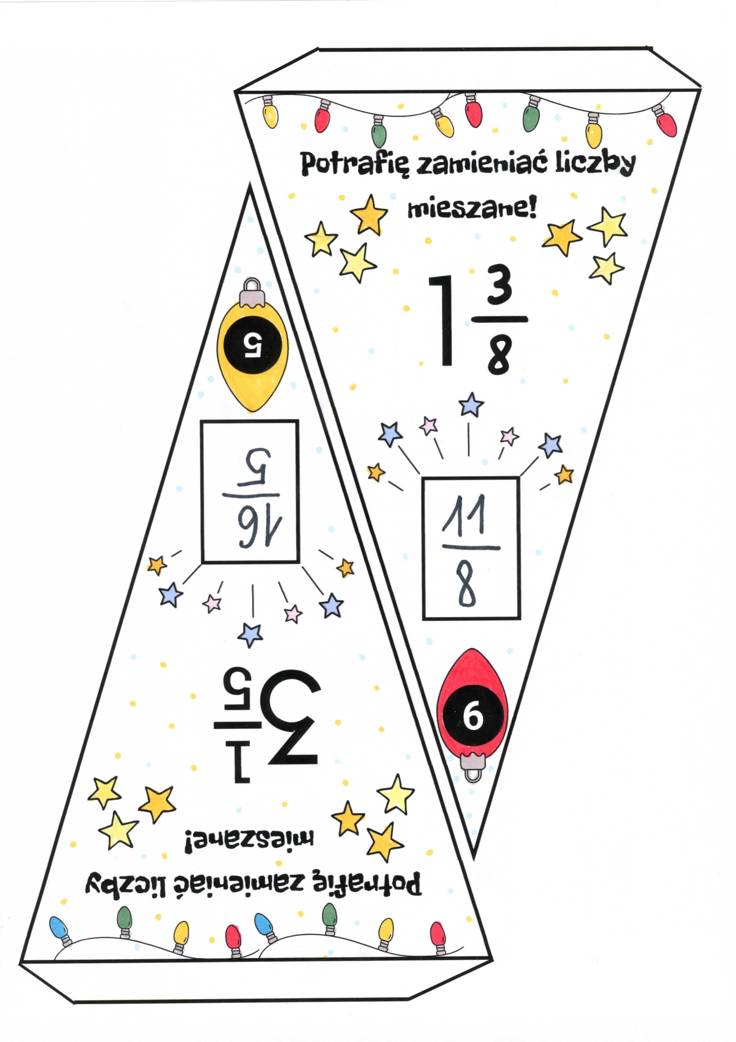 Uczniowie zamieniają wyznaczoną liczbę mieszaną, wpisują wynik w prostokąt, kolorują ozdoby> Na koniec łączymy wszystkie elementy w girlandę, która może ozdobić klasę.