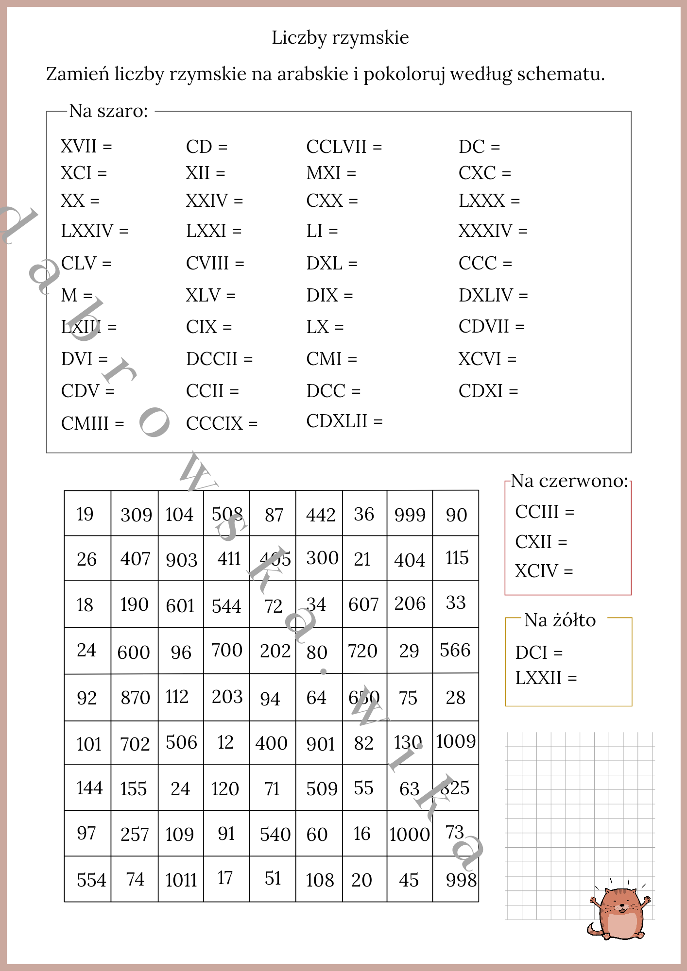 Materiał zawiera kartę pracy dotyczącą zamiany liczb rzymskich na liczby arabskie.