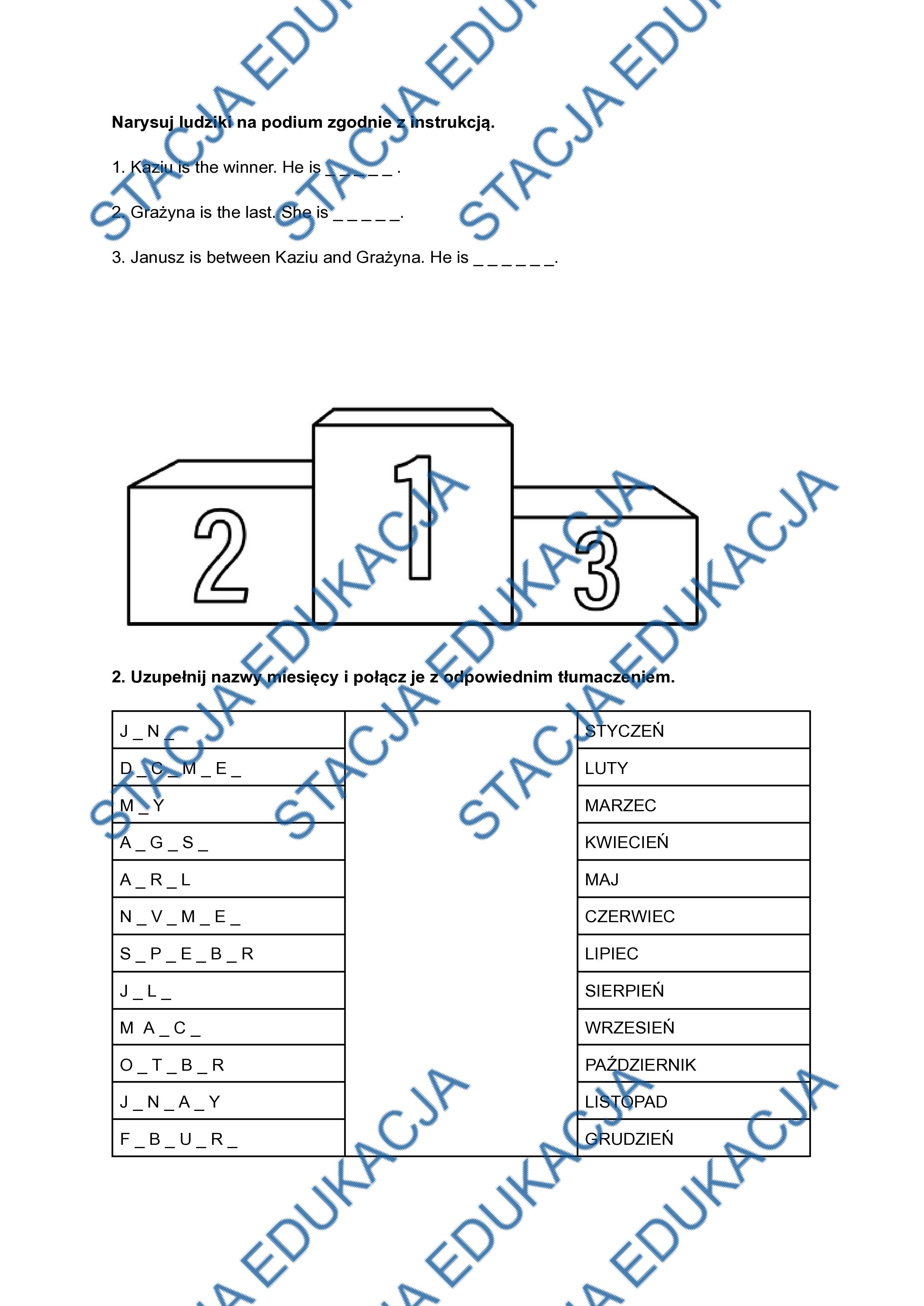 - Uczniowie muszą narysować postaci na podium, zgodnie z podanymi instrukcjami. Przykładowo: Kaziu jest zwycięzcą, Grażyna jest ostatnia, co pomaga uczniom ćwiczyć angielskie liczebniki porządkowe.