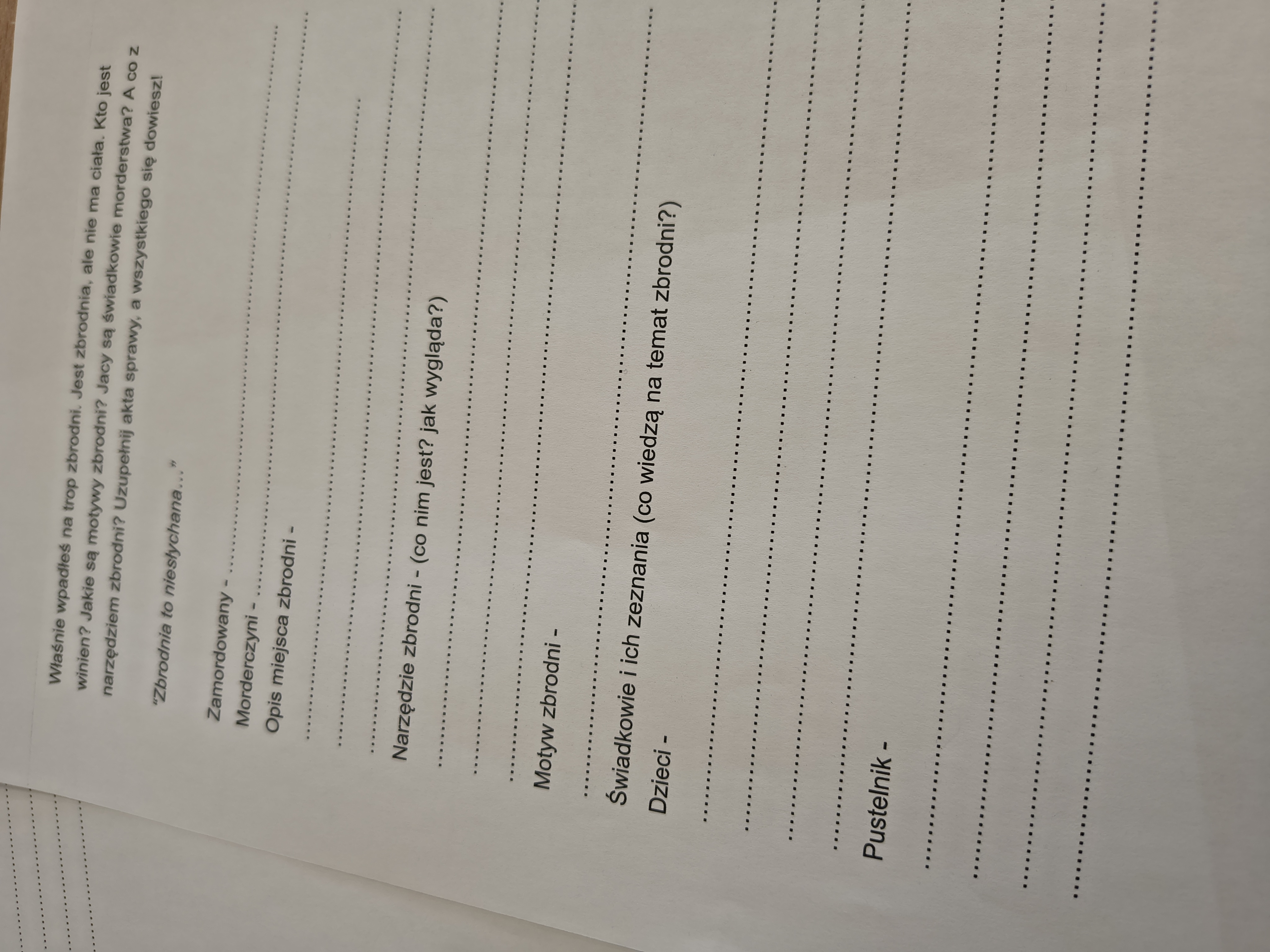 Interpretacja ballady Mickiewicza "Lilije" w dwóch wersjach. Interpretacja ma przypominać "akta" zbrodni. Uczniowie muszą odpowiedzieć na pytania kto i kogo zamrodował, co jest narzedziem zbrodni, jak wygląda miejsce zbroni oraz zbierają zenania świadków. Wersja krótsza - przenaczona na 1 godzinę lekcyjną, wersja dłuższa przeznaczona na 2 godziny lekcyjne.