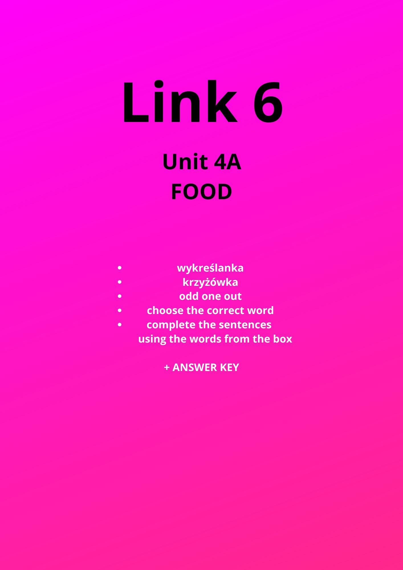 Zawartość: 1 plik PDF, 6 stron (zestaw ćwiczeń do Unit 4a). Co rozwija: utrwalanie słownictwa/struktur z rozdziału, czytanie krótkich poleceń, poprawność językową, pracę samodzielną i sprawdzanie odpowiedzi. Zastosowanie: lekcja stacjonarna, praca w klasie, sprawdzian „na szybko”, praca domowa, stacje zadaniowe.