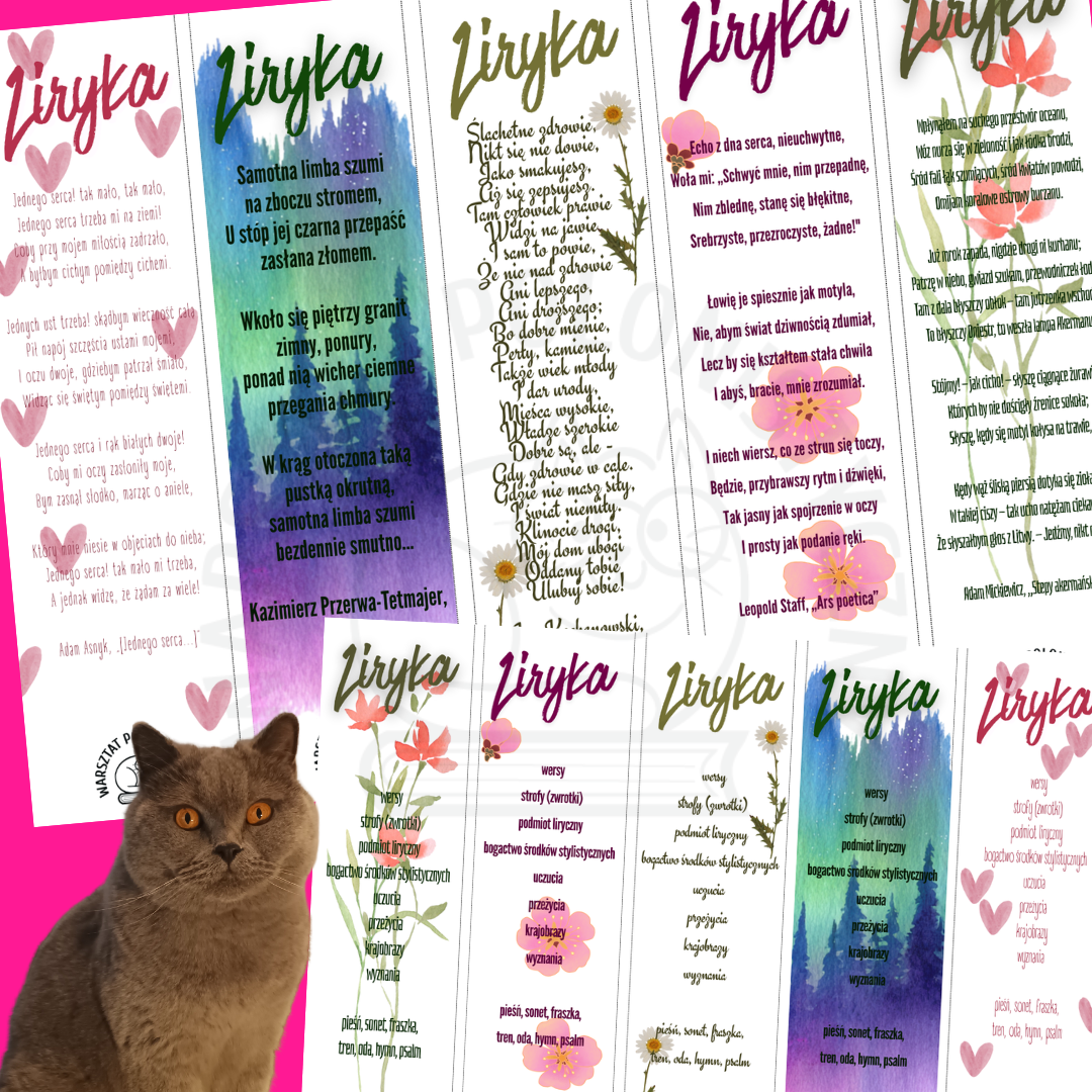 Piękne i przydatne zakładki do książek. Na jednej stronie znajduje się wiersz, na drugiej najważniejsze cechy liryki. Świetna pomoc dla uczniów szkół podstawowych i średnich, czytelniczy gadżet, który zachęca do działania i pomaga zapamiętywać. Zachęcam, aby zakładki zalaminować lub wydrukować na grubszym papierze.