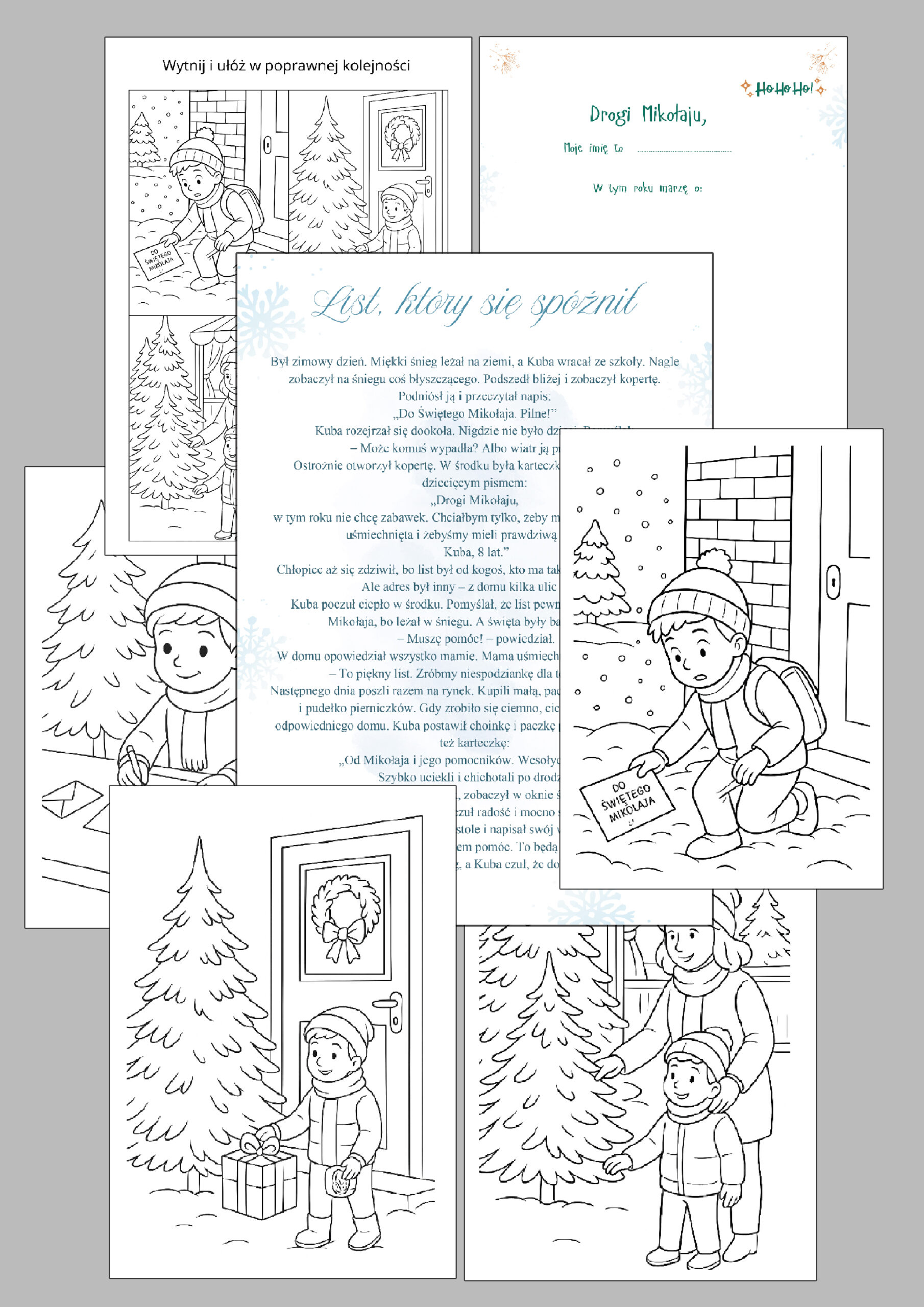 Materiał zawiera krótkie, proste i ciepłe opowiadanie pt. „List, który się spóźnił”, specjalnie dostosowane do dzieci w wieku przedszkolnym. Historia Kuby, który znajduje zagubiony list do Mikołaja i postanawia pomóc innemu dziecku, wprowadza maluchy w klimat zimy, dobroci i świątecznej magii.