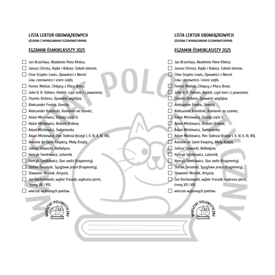 LISTA LEKTUR - EGZAMIN ÓSMOKLASISTY 2025 - wklejka, notatka, checklista.