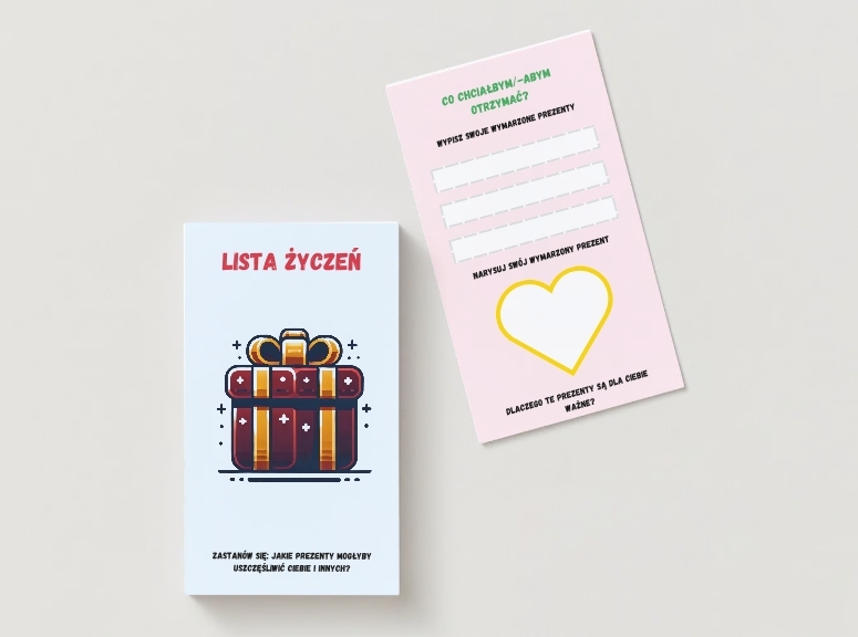 - Przestrzeń do przemyślenia i zapisania, co sprawia największą radość podczas świąt oraz jakie uczucia towarzyszą dawaniu prezentów innym.