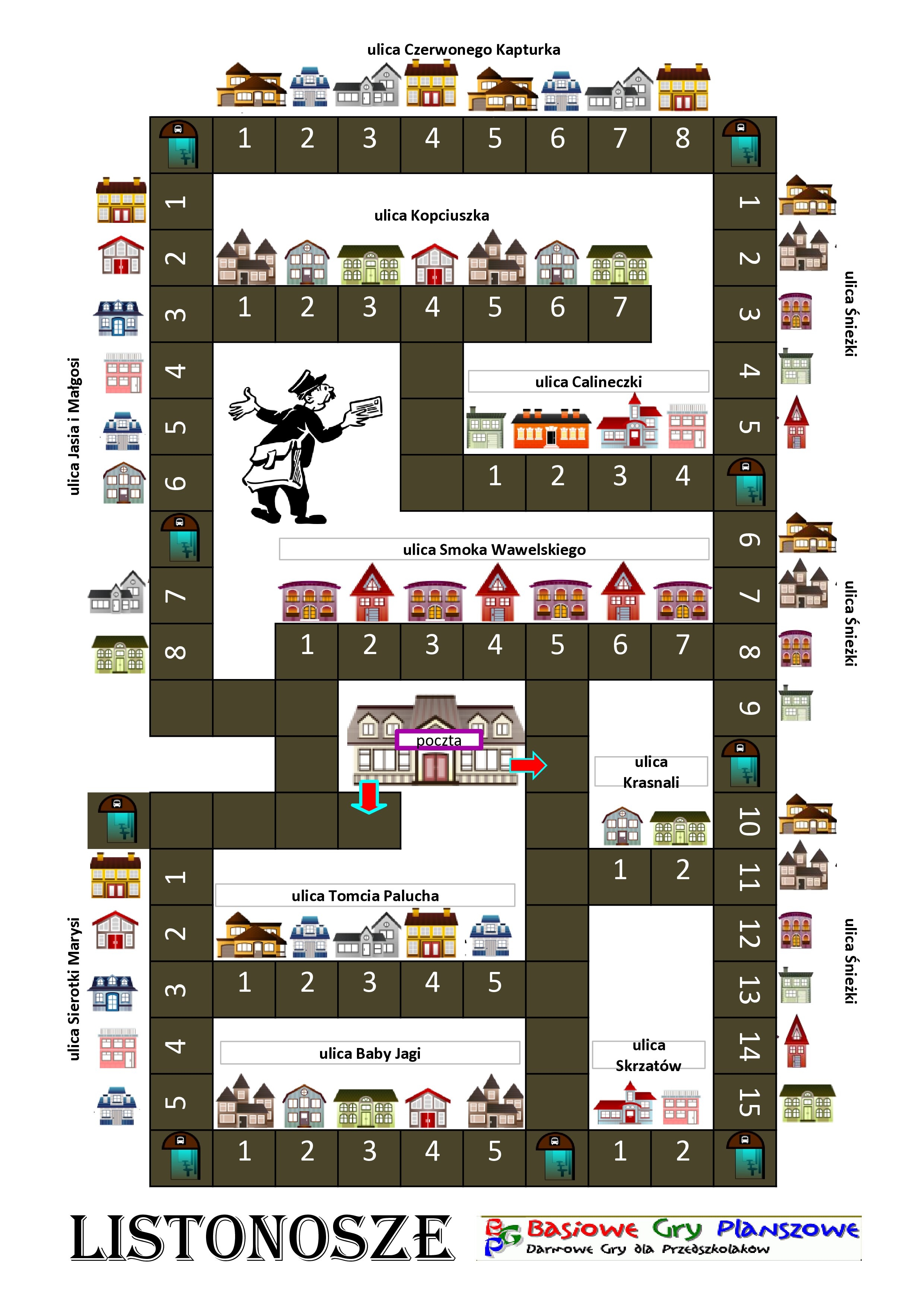 Listonosze to gra planszowa, w której celem graczy jest rozniesienie jak największej liczby listów do adresatów. Uczy orientacji w przestrzeni oraz posługiwania się mapą.