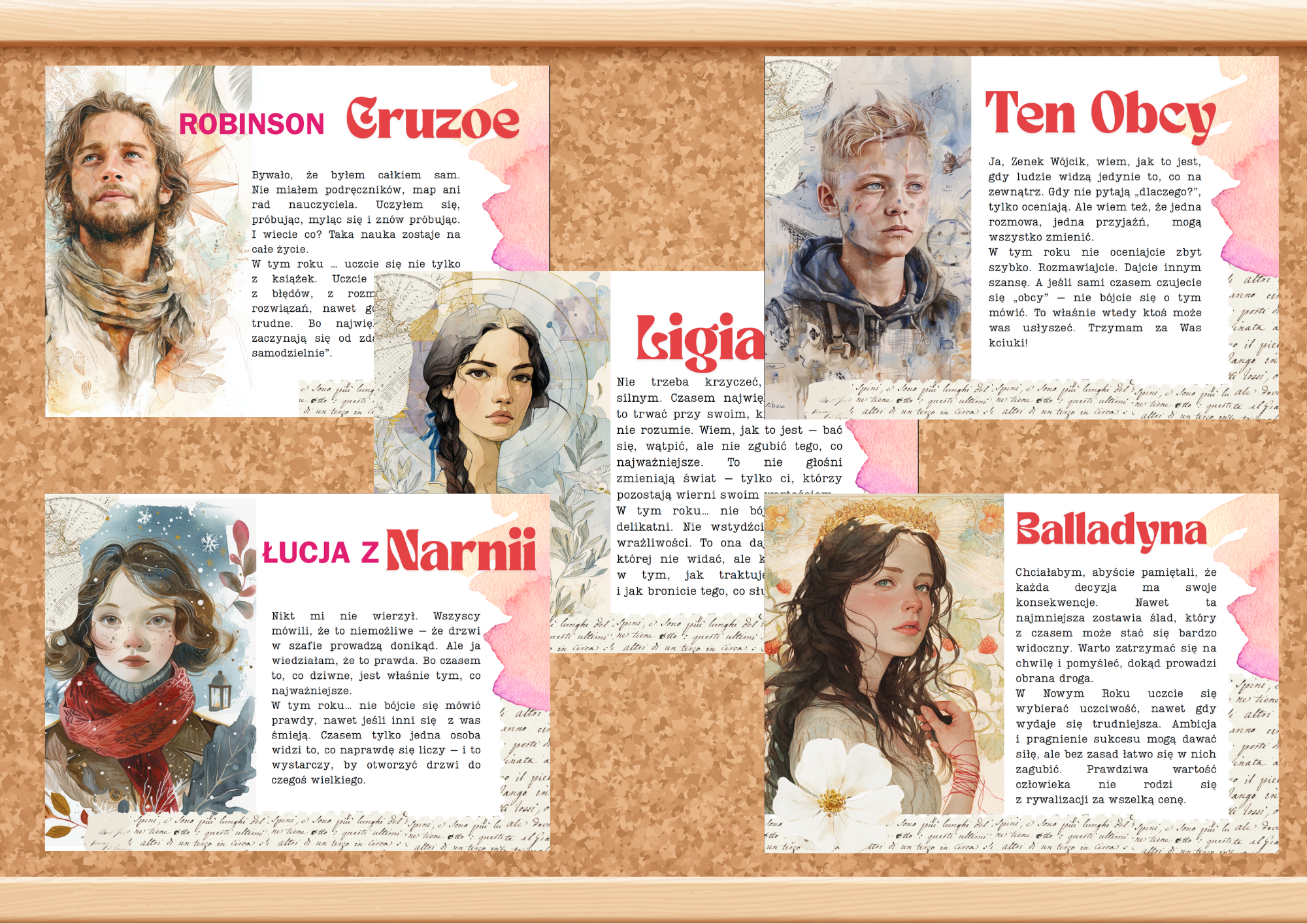 Zestaw „Listy na Nowy Rok od bohaterów lektur” to estetyczne, artystycznie zaprojektowane karty PDF, które łączą literaturę z nowoczesnym wychowaniem do wartości. Każda karta prezentuje list od bohatera lektury – napisany w pierwszej osobie, poruszający ważne tematy emocjonalne i wychowawcze – oraz puste karty przeznaczone do samodzielnej pracy uczniów. Gotowe karty inspirują do refleksji, rozmowy i autorefleksji, a puste karty pozwalają uczniom zapisać własne myśli, odpowiedzi, postanowienia i wnioski. Dzięki temu materiał nie jest jedynie do czytania, ale staje się narzędziem aktywnej pracy i dialogu.