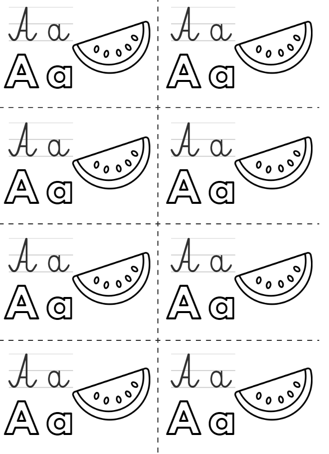Zestaw wklejek do zeszytu dla ucznia.  32 litery alfabetu - czarno -białe (zapis szkolny i drukowany + obrazek).  Wklejki do samodzielnego wykrukowania i wycięcia.  Na każdej stronie jest 8 liter.  Plik pdf.