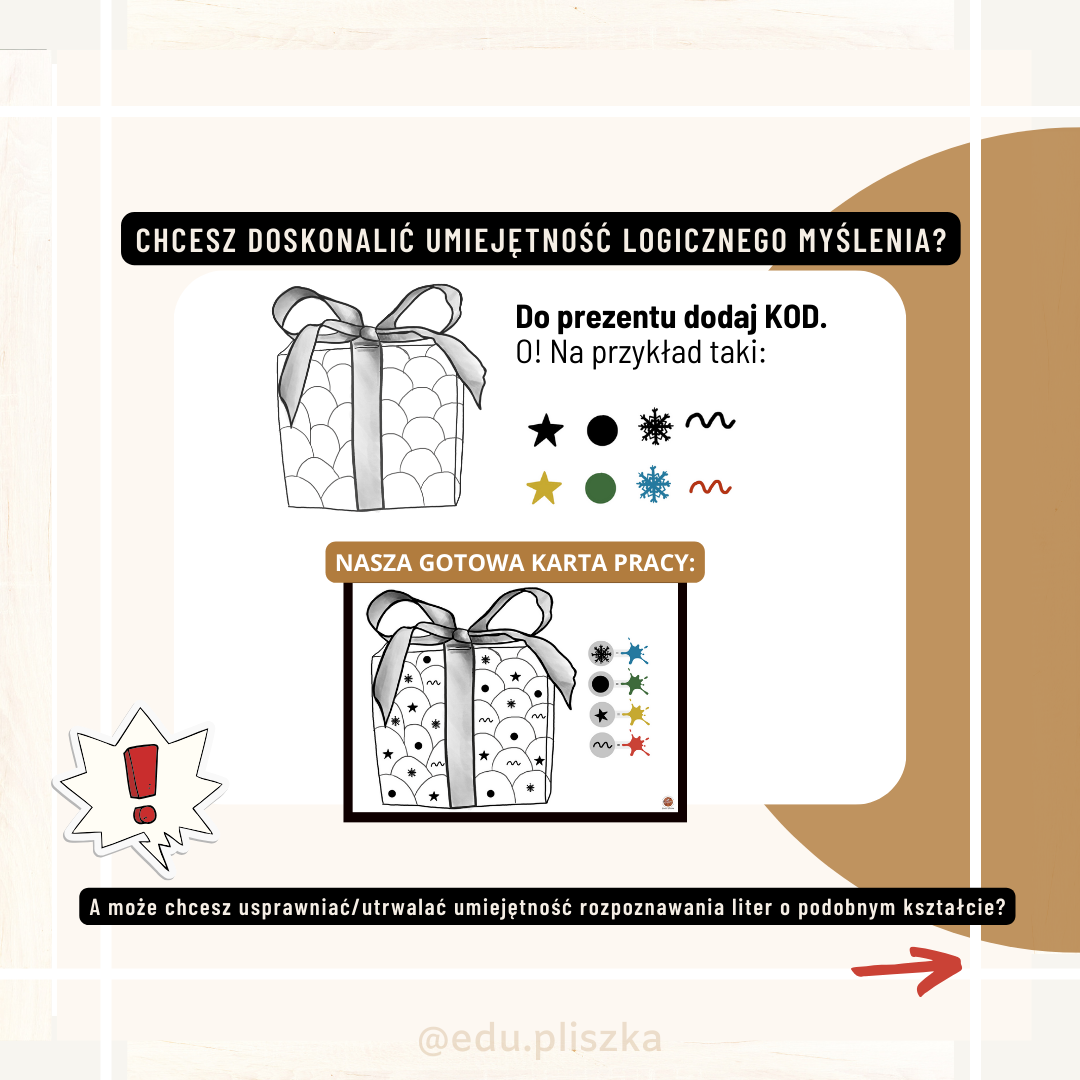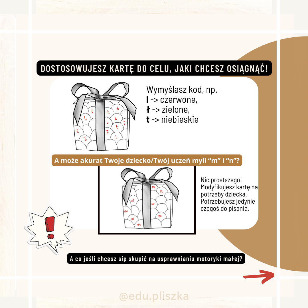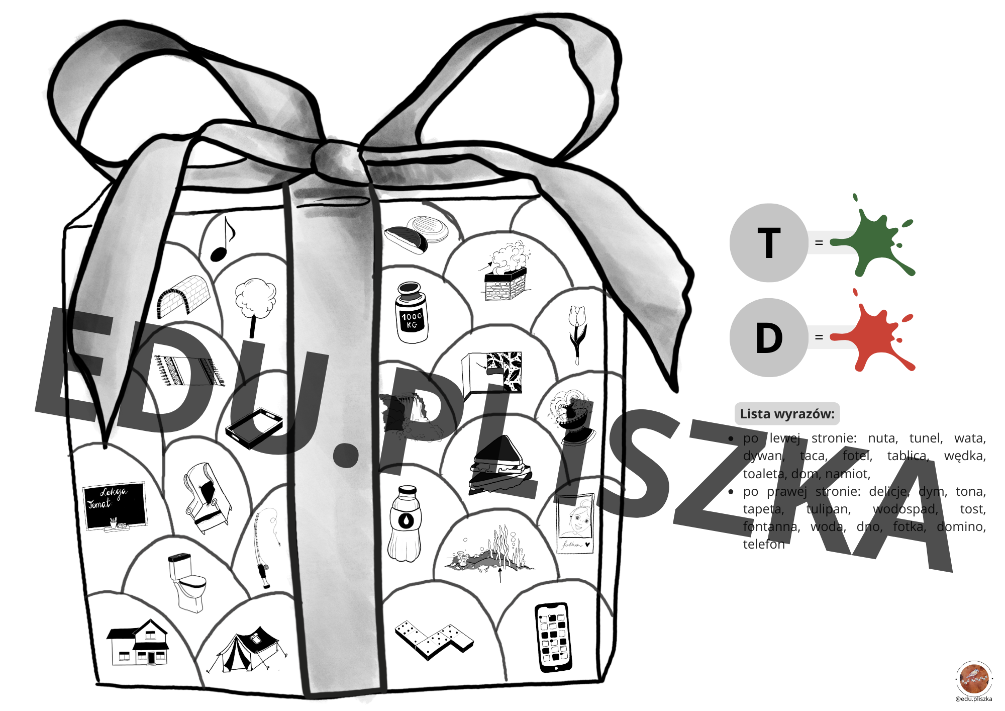 Zadaniem dziecka jest zapełnienie rysunku (prezentu) plasteliną, bibułą, kredką lub stemplem w odpowiednim kolorze. Ćwiczenie ma na celu usprawnianie słuchu fonematycznego i rozwijanie umiejętności logicznego myślenia.