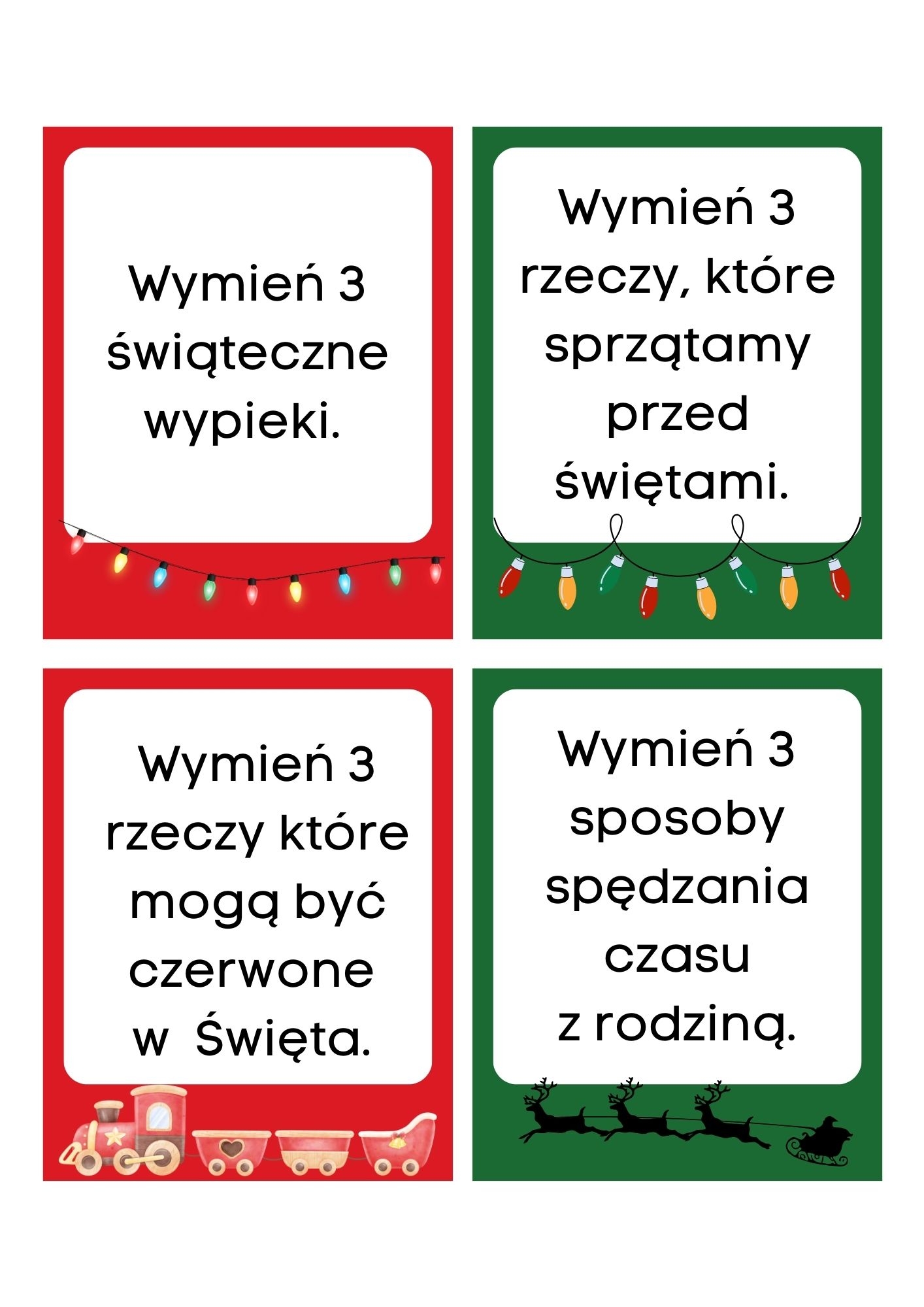 Świąteczna Rozgrywka w Klasie” to kompletny zestaw gier i aktywności idealny na wigilię klasową! Znajdziesz w nim cztery różnorodne zabawy – 5 sekund, Kalambury, Memory skarpetkowe i Taboo – wszystkie w tematyce świątecznej i dostosowane do uczniów klas 1–8.