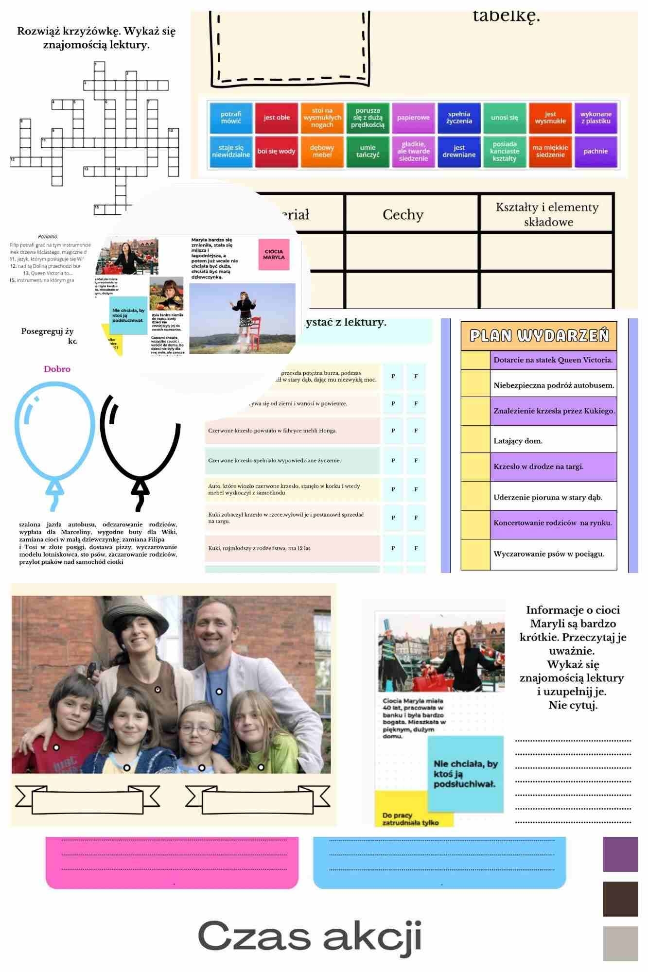 * Analiza bohaterów: Materiał zawiera zadania poświęcone charakterystyce postaci, w tym intrygujący moduł dotyczący tajemniczej cioci Maryli.