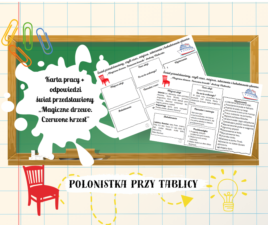 Materiał zawiera kartę pracy -> miejsce do uzupełnienia informacjami o świecie przedstawionym powieści A. Maleszki „Magiczne drzewo. Czerwone krzesło” (strona formatu A4) i przykładowe rozwiązanie.. Karta będzie wygodnym sposobem na urozmaicenie lekcji i uporządkowanie informacji.