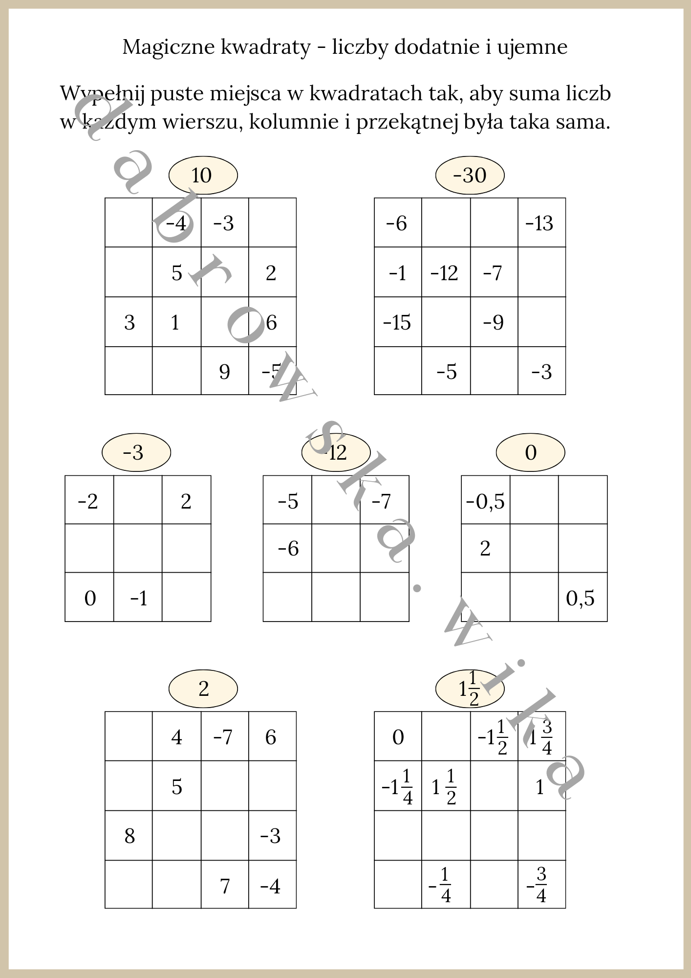 Materiał zawiera cztery magiczne kwadraty 4×4 i trzy magiczne kwadraty 3×3, które doskonale sprawdzą się w ramach ćwiczeń w dodawaniu i odejmowaniu liczb dodatnich i ujemnych oraz pobudzą kreatywne myślenie.