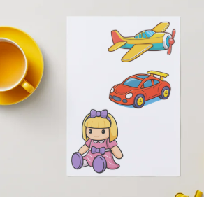 Materiał zawiera obrazek pudełka do druku - dwie wersje dwustronne, a także obrazki zabawek do przyklejenia w środku - 6 szt.