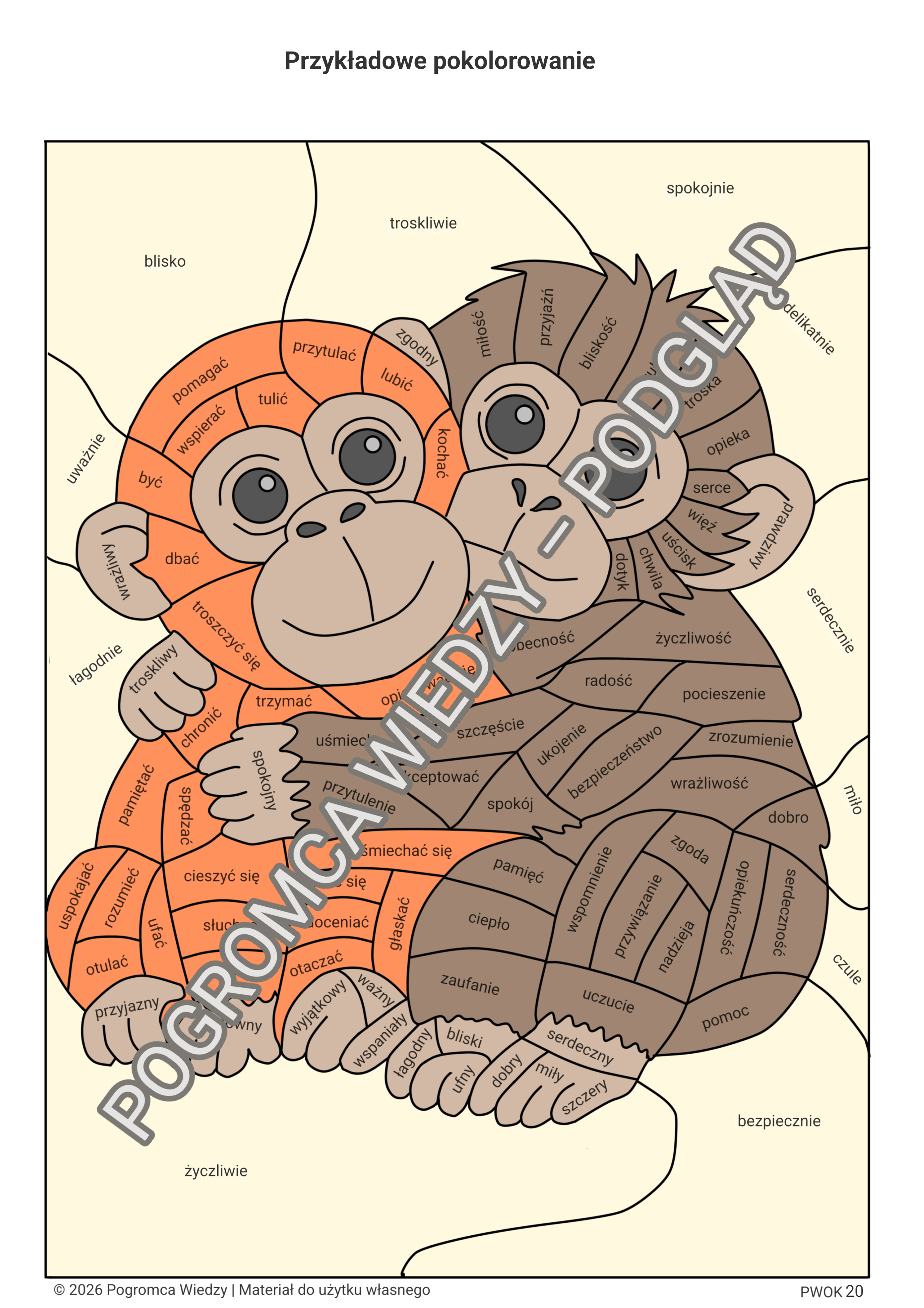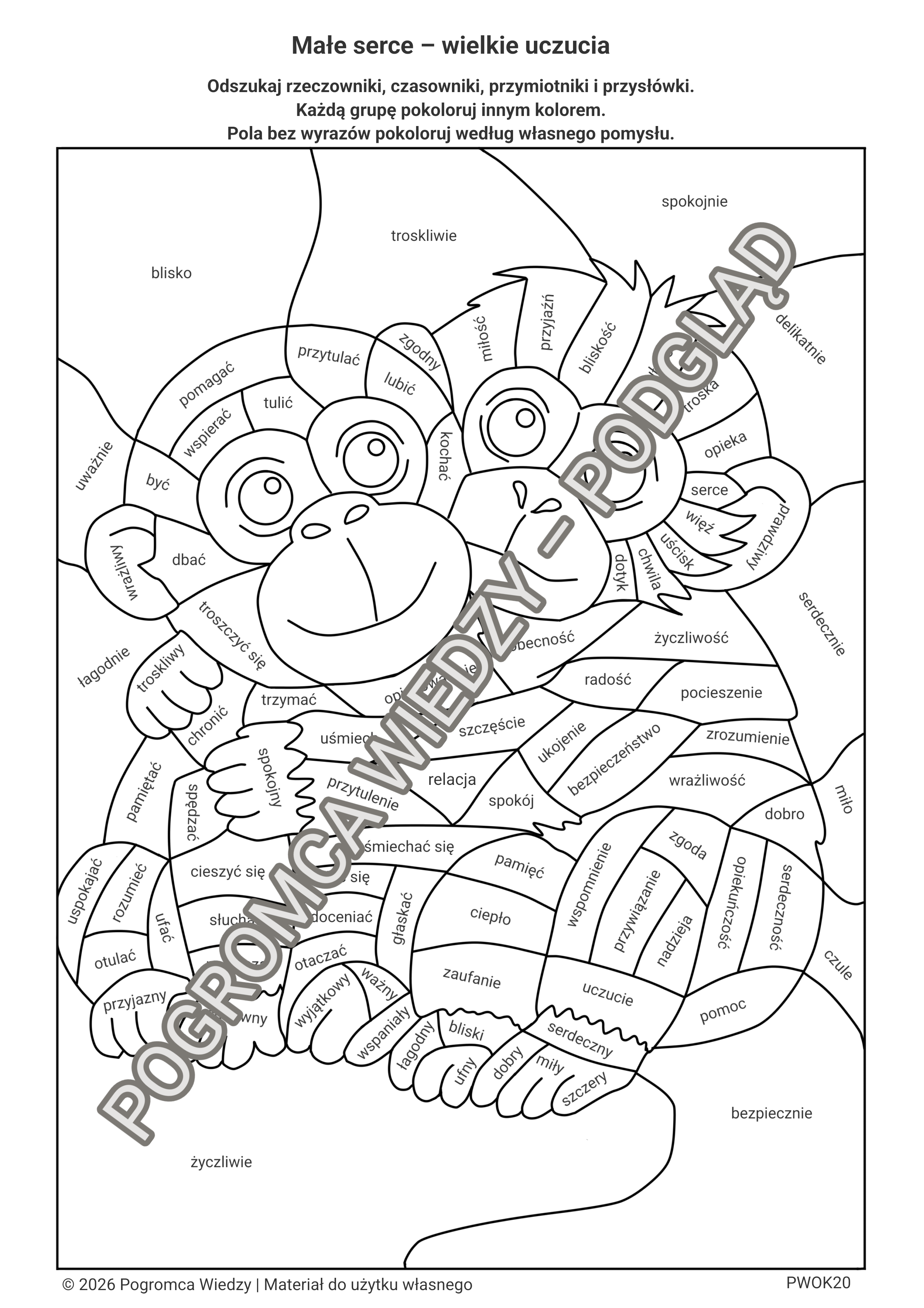 Karta pracy „Małe serce – wielkie uczucia” to ćwiczenie utrwalające części mowy. Uczniowie wyszukują w mozaice rzeczowniki, czasowniki, przymiotniki i przysłówki, a następnie kolorują je według podanego klucza. Zadanie rozwija umiejętność rozpoznawania części mowy oraz koncentrację. Tematyka emocji sprawia, że karta jest atrakcyjna i angażująca dla uczniów klas 4–6.