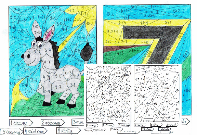 Malowanki, które można wykorzystać na zajęciach edukacji matematycznej w klasie I (dodawanie i odejmowanie w zakresie 10) po wprowadzeniu zmiękczenia si. Materiał edukacyjny skorelowany jest z podręcznikiem "Szkolni Przyjaciele" Wydawnictwa WSiP. Plik zawiera również rozwiązanie obu zadań.