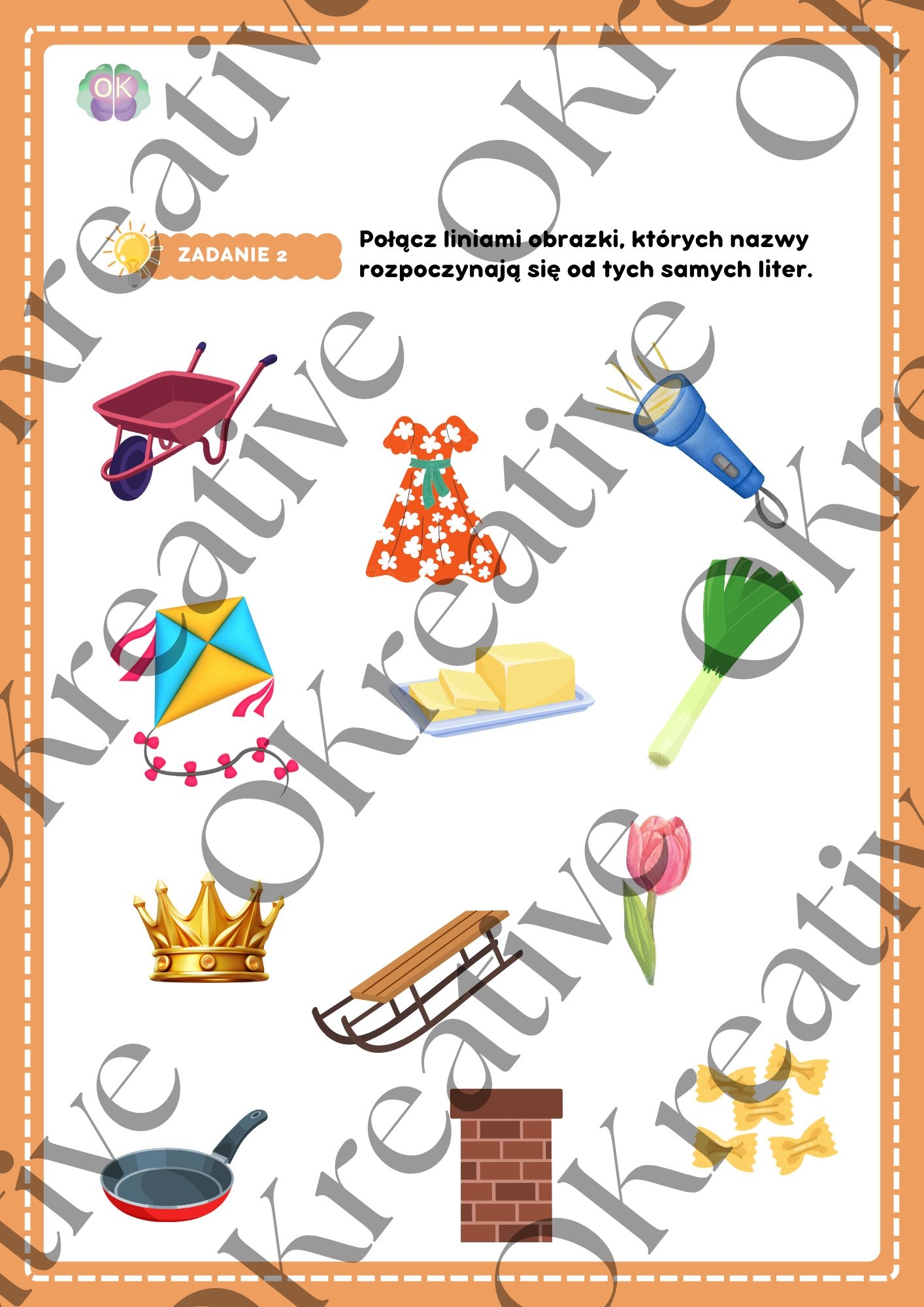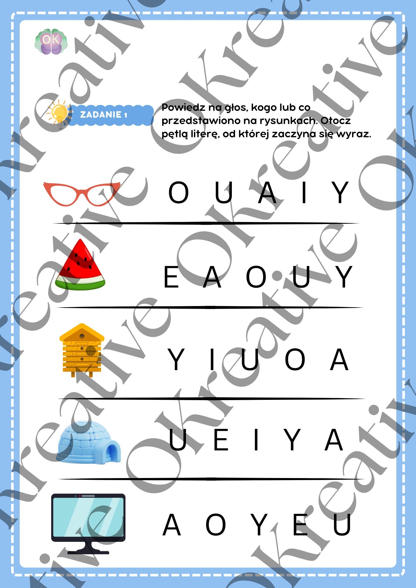• Odczytywanie na głos nazw obrazków i otaczanie liter, od których zaczyna się wyraz lub które słychać na końcu,