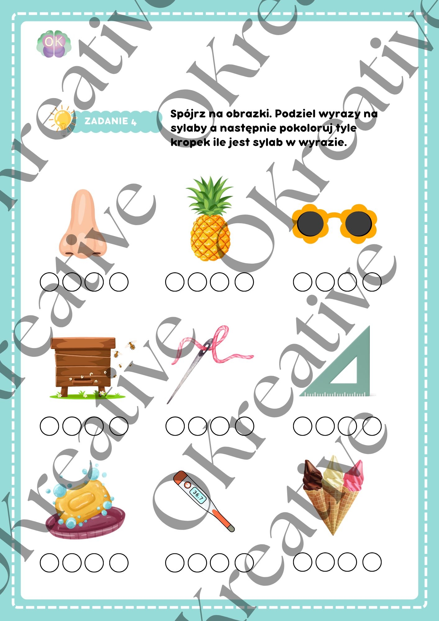 • Dzielenie wyrazów na sylaby i kolorowanie odpowiedniej liczby kropek,