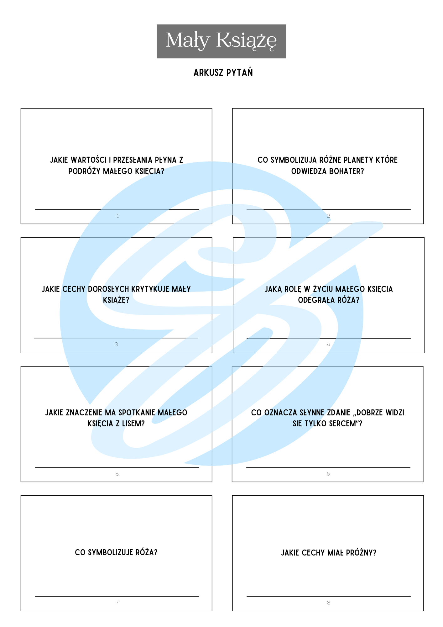 Szukasz angażującego sposobu na omawianie Małego Księcia Antoine’a de Saint-Exupéry’ego w szkole podstawowej? Nasz zestaw „Mały Książę – Pytania i Odpowiedzi” to interaktywne karty pracy, które pomagają uczniom lepiej zrozumieć treść i przesłanie lektury, a także aktywnie uczestniczyć w zajęciach.