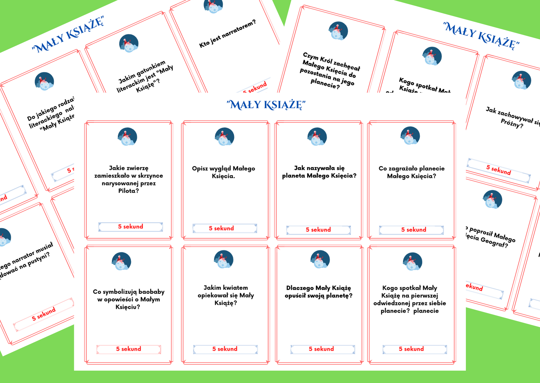 Zestaw 6 kart (format A4 pdf) z 48 karteczkami do gry „5 sekund”, zawierającymi pytania dotyczące treści "Małego Księcia". Można wykorzystać je na lekcjach powtórzeniowych. Karty należy wyciąć i ewentualnie zalaminować, by dłużej posłużyły. Można także wydrukować je na kolorowym papierze.