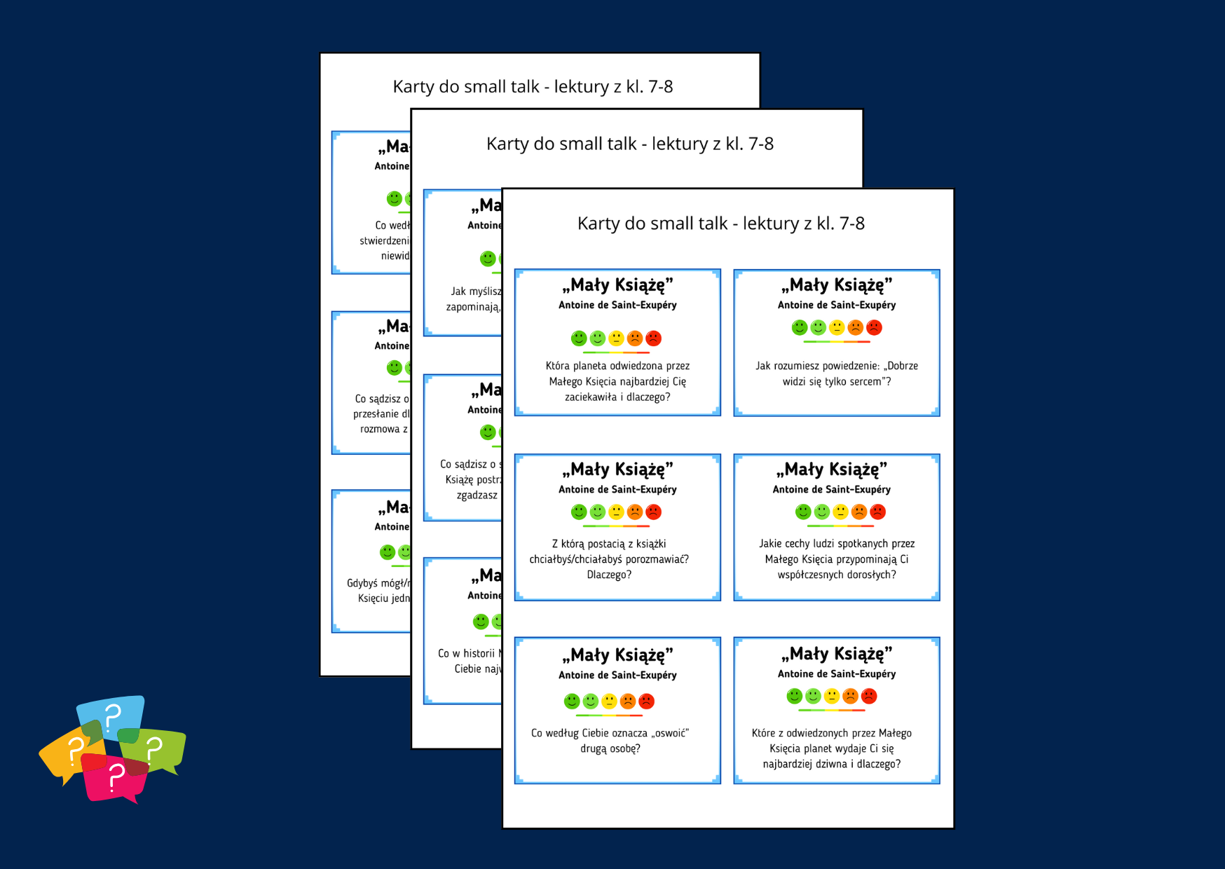 18 pytań typu „Karty small talk” do „Małego Księcia”. Takie pytania mają charakter swobodny, zachęcają do refleksji, rozmowy i dzielenia się opinią, a nie tylko sprawdzają wiedzę. Mogą być wykorzystywane na lekcjach jako forma integracji z lekturą lub podczas luźniejszych rozmów literackich. Dzięki nim można ćwiczyć wypowiedź argumentacyjną. Zasady: uczeń losuje kartę i odpowiada na pytanie (lub wszyscy uczniowie odpowiadają na to samo pytanie).