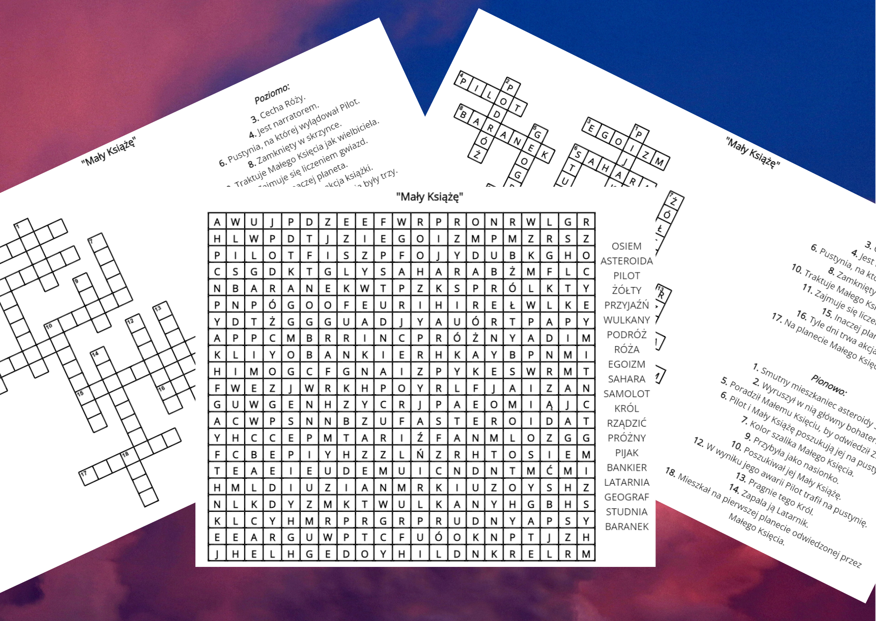 Zestaw "MAŁY KSIĄŻĘ" zawierający wykreślankę oraz krzyżówkę (pustą i uzupełnioną).