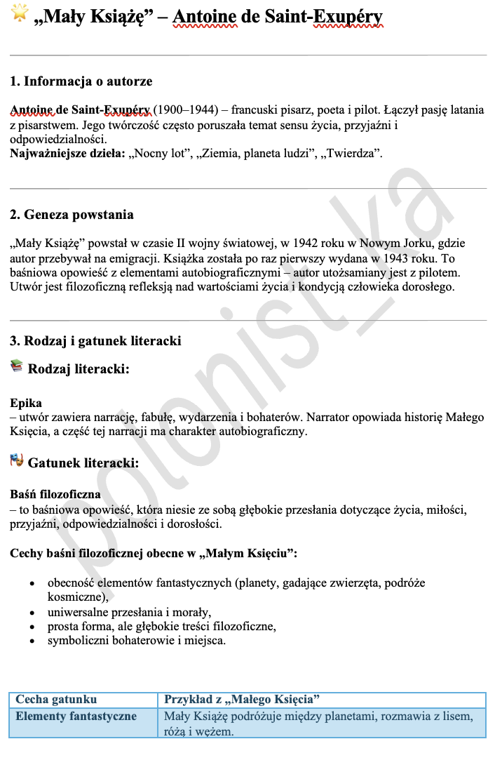 Opracowanie lektury "Mały Książę" w pigułce. Świetne do powtórki przed sprawdzianem.