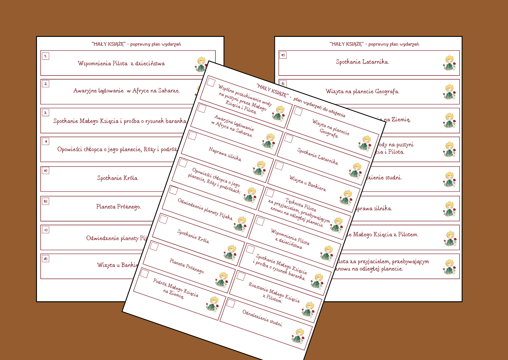 Materiał zawiera fiszki w 3 wersjach planu wydarzeń (pdf, format A4) dotyczącego treści „Małego Księcia”: wersja planu poprawnego i wersja do ułożenia dla uczniów (można ją rozdać uczniom, by mogli – po wycięciu i ułożeniu – wkleić poprawny plan do zeszytu), większy format – wersja do ułożenia dla grup ( można ją po wydrukowaniu zalaminować, by posłużyła dłużej i wyciąć).