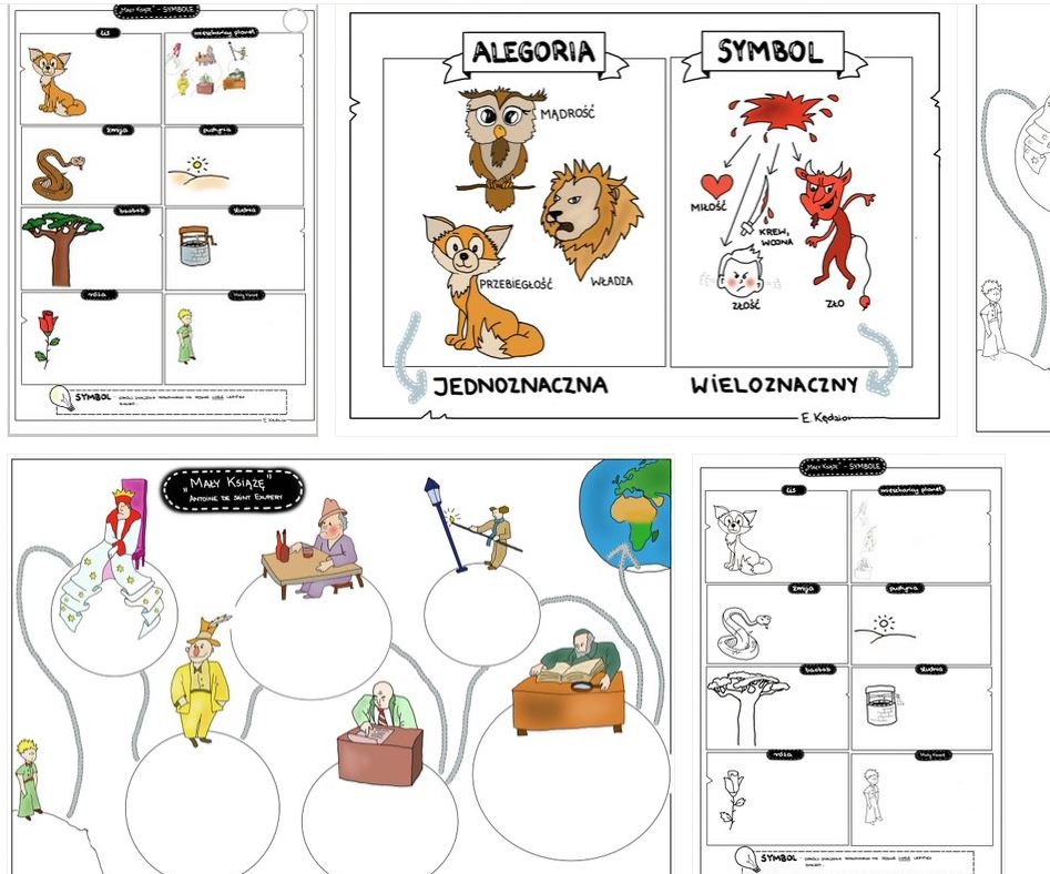 Materiał zawiera trzy rodzaje kart: 1. Podróż Małego Księcia - pusta, czarno-biała i w kolorze, karta do wypełnienia podczas czytania lektury "Mały Książę"; 2. Symbole w "Małym Księciu" - karta pusta i wypełniona 3. Plansza utrwalająca pojęcia symbolu i alegorii