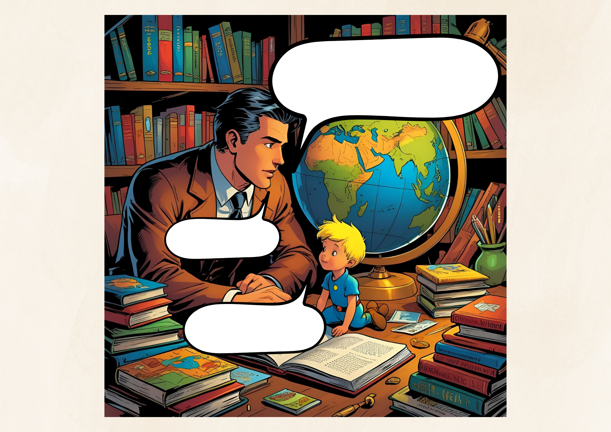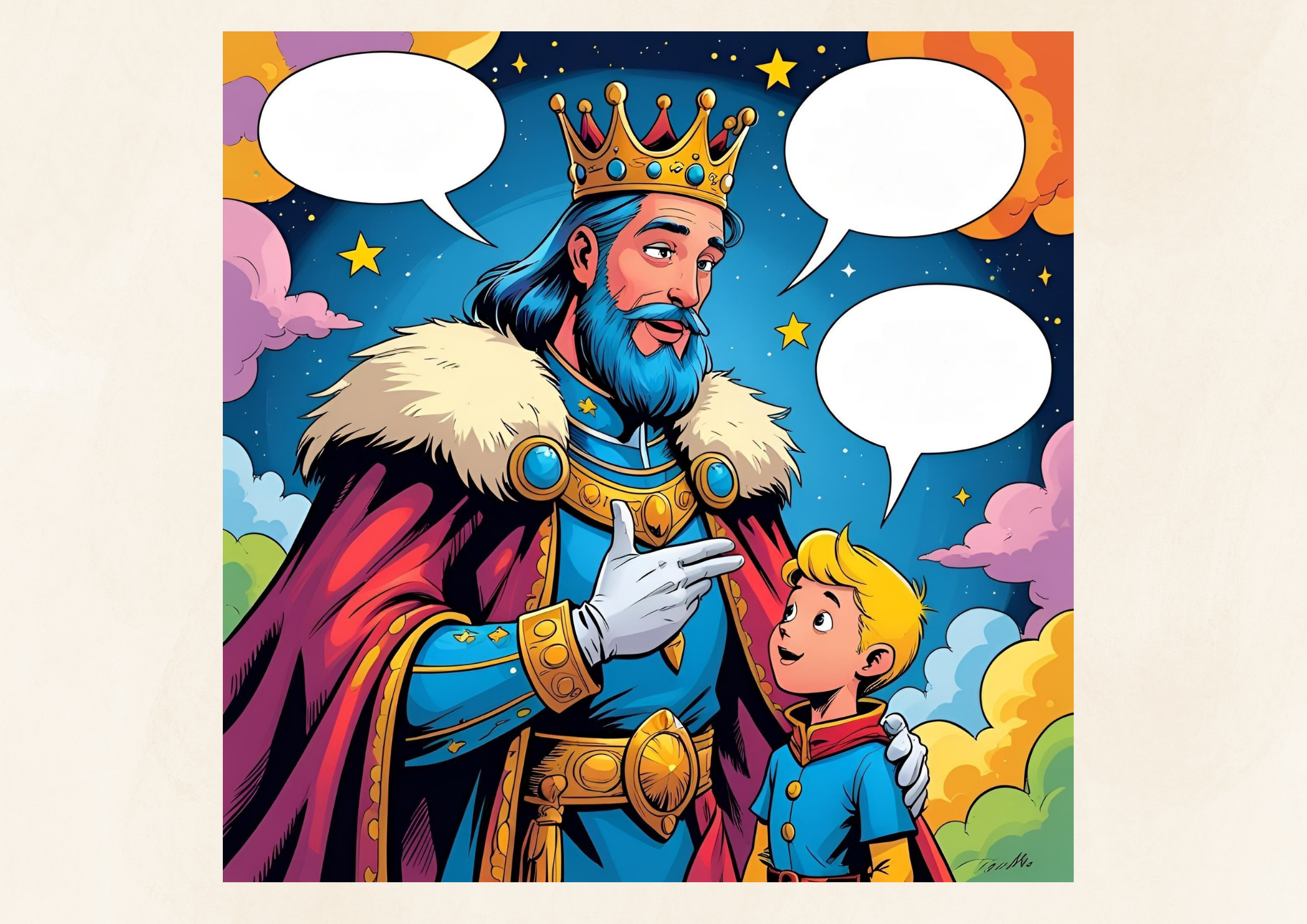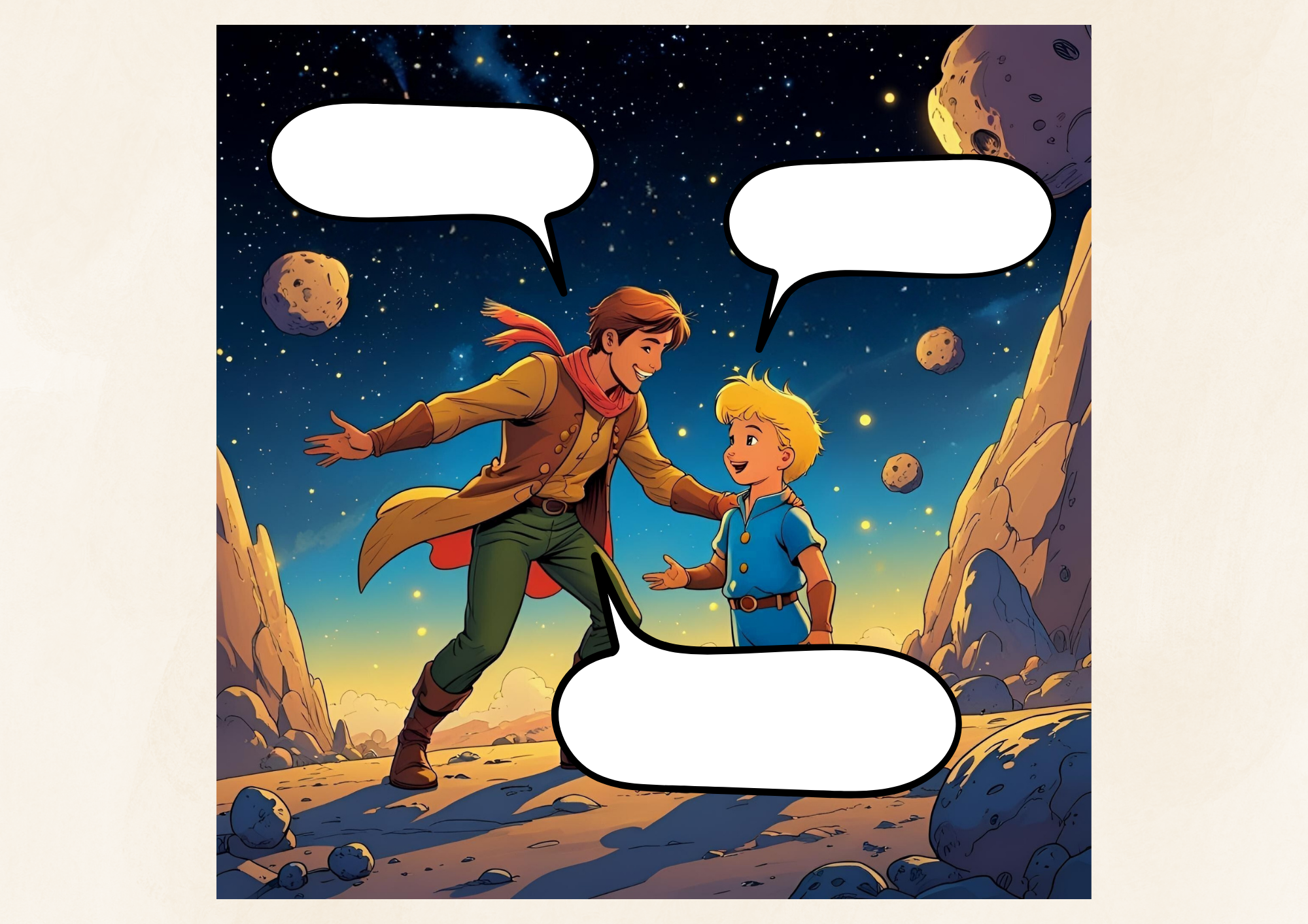 Każda ilustracja przedstawia dwie postacie – Małego Księcia i rozmówcę – z pustymi dymkami. Zadaniem uczniów jest je twórczo uzupełnić, zachowując charakter i przesłanie postaci.