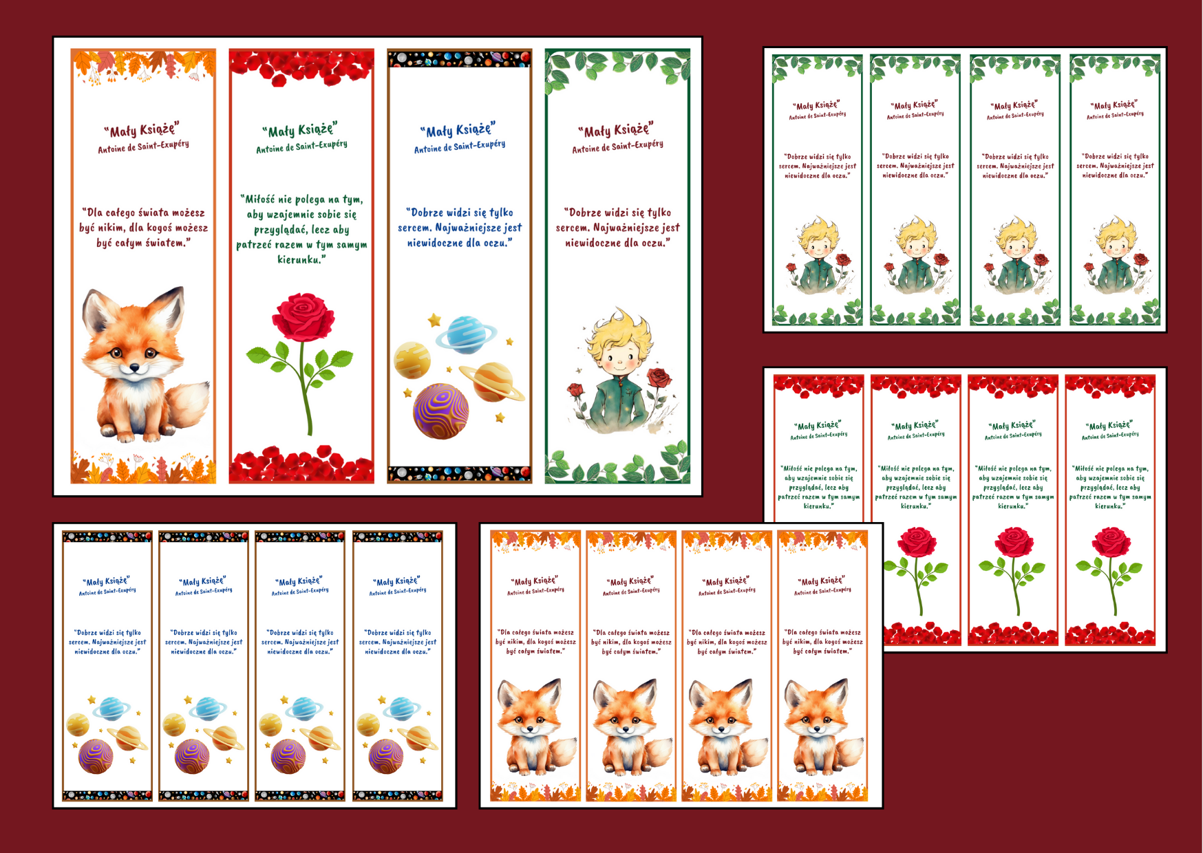 4 wersje zakładek do książek związane z "Małym Księciem". Po wydrukowaniu i wycięciu zakładki warto zalaminować ( ewentualnie wydrukować na grubszym papierze).