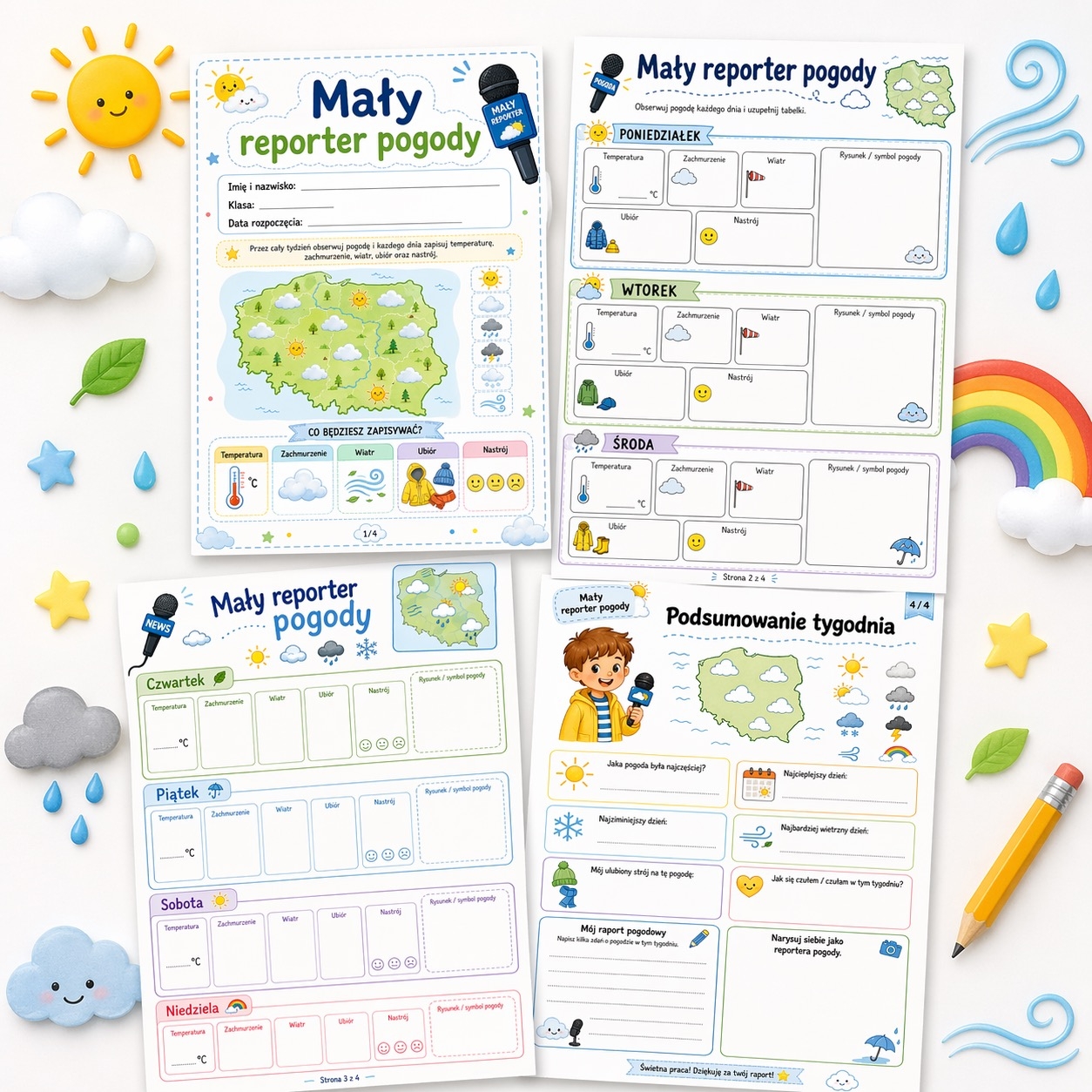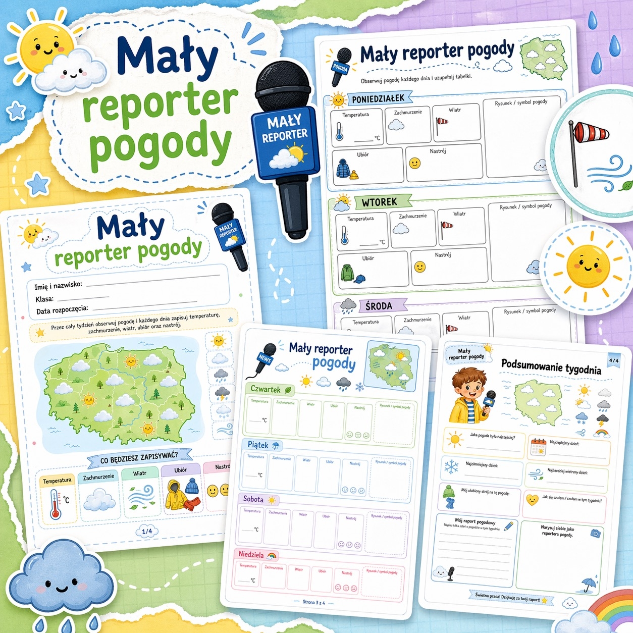 Materiał świetnie sprawdzi się podczas zajęć przyrodniczych, edukacji wczesnoszkolnej, rozmów o porach roku, zmianach pogody i codziennych obserwacjach. Kolorowe grafiki, mikrofon reportera, mapka z chmurkami i ikony pogody zachęcają dzieci do pracy i ułatwiają samodzielne uzupełnianie kart. ☀️🌧️💨