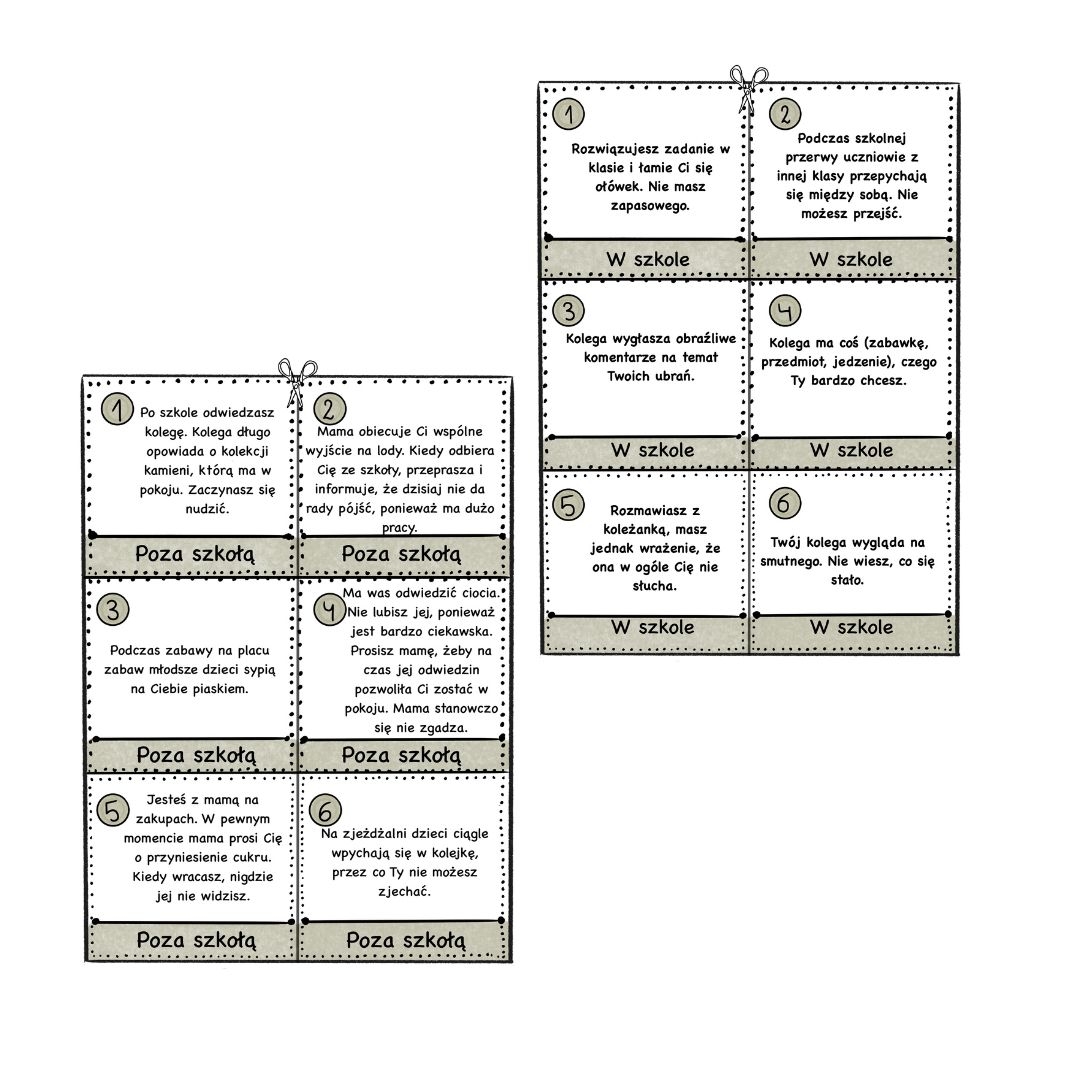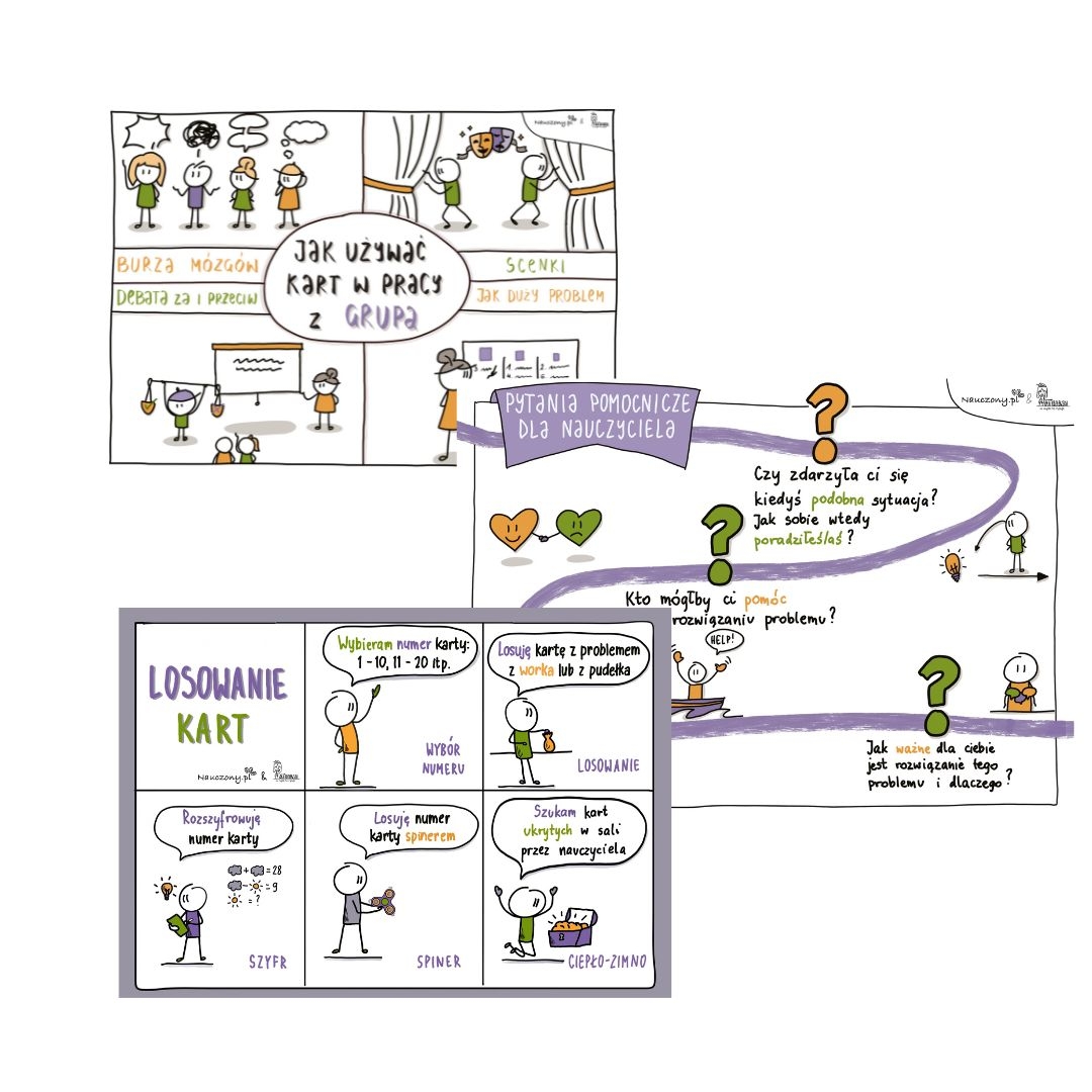 Karty należy wyciąć, a jeśli to możliwe, zaleca się również ich zalaminiowanie, aby posłużyły przez dłuższy czas. Następnie gotowe karty umieszczamy w worku lub pudełku, choć można także skorzystać z innych sposobów losowania kart, które znajdują się na notatce wizualnej „Losowanie kart”. Uczeń wybiera kartę z opisanym na niej konkretnym problemem, po czym pytamy go, czy kiedykolwiek doświadczył podobnej sytuacji.