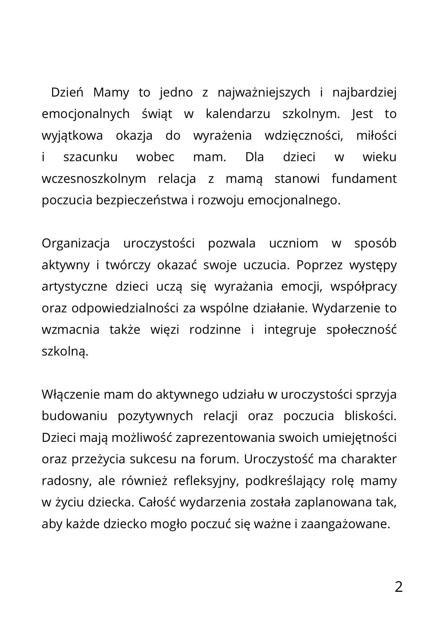 Scenariusz wspiera rozwój kompetencji społecznych, budowanie relacji oraz wzmacnianie poczucia wartości u dzieci, jednocześnie tworząc przestrzeń do wyrażania emocji i wdzięczności. To gotowe narzędzie dla nauczycieli, które pozwala w prosty sposób przygotować wartościową i wzruszającą uroczystość szkolną.