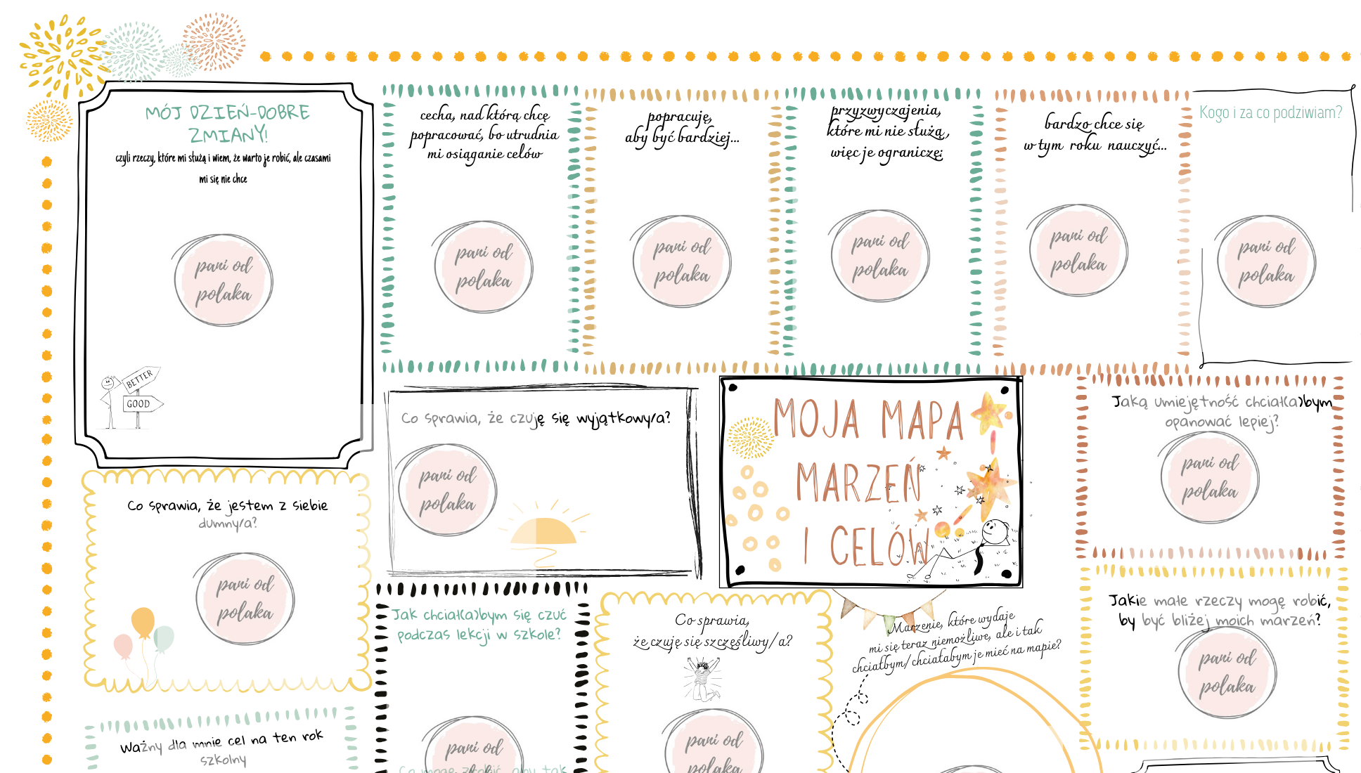 Mapa marzeń i celów świetnie się sprawdzi podczas pierwszej godziny wychowawczej w nowym roku szkolnym, będzie także doskonałym rozpoczęciem pierwszej lekcji języka polskiego. Mapa w formie karty pracy z okienkami do wpisywania swoich odpowiedzi, pomoże uczniom określić swoje cele, zastanowić się nad czym chcą pracować w nowym roku szkolnym, umożliwi także w sposób krytyczny przeanalizować co sprzyja, a co przeszkadza im osiągać to, co sobie zaplanowali. Estetyczna forma graficzna uprzyjemni pracę. Narzędzie odpowiednie dla uczniów od klasy czwartej szkoły podstawowej aż po licealistów.