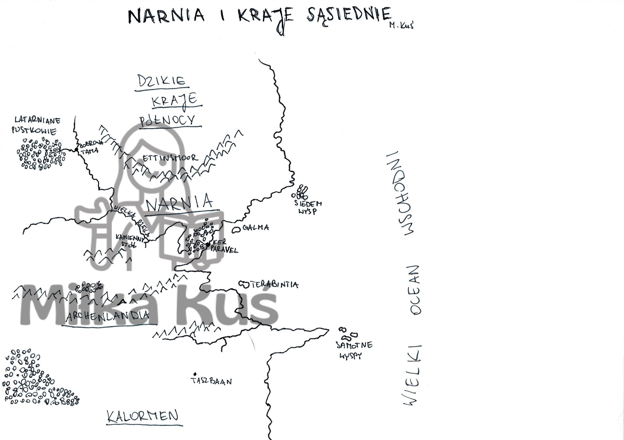 Czarno-biała mapa Narnii i krajów sąsiednich, która przyda się podczas omawiania lektury. Uczniowie mogą oznaczyć drogę , którą przebyli główni bohaterowie pierwszej części serii lub po prostu pokolorować rysunek i wkleić do zeszytu.