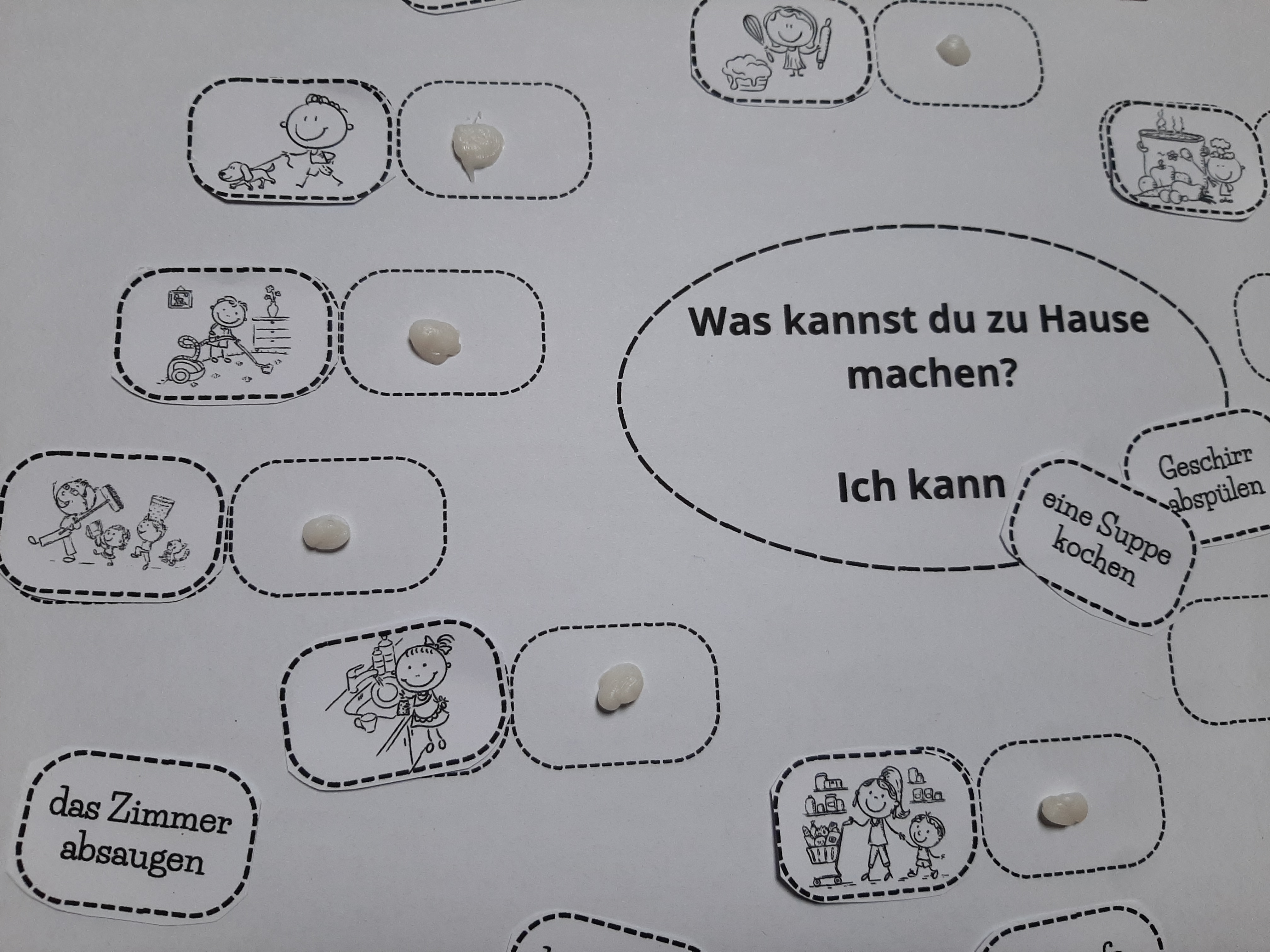 Rozwijanie znajomości słownictwa, tworzenie zdań, zadania do samodzielnych powtórek. Zestaw zawiera 3 karty pracy odnośnie nazw sportów, czynności wykonywanych w domu oraz nazw zwierząt. Materiał został poszerzony o słownictwo z zakresu: pojazdy, miejsca w mieście, zabawki, meble. Na podstawie podanego słownictwa - ilustracja i nazwa w j. niemieckim - w prosty sposób można tworzyć mapy myśli, wklejki do zeszytu, słowniczek obrazkowy, a także wykorzystywać do gier. Do materiału dodatkowo zostały przygotowane plansz (strony 16-22), które po zalaminowaniu mogą być wykorzystywane jako stacje zadaniowe lub zadania sprawdzające.