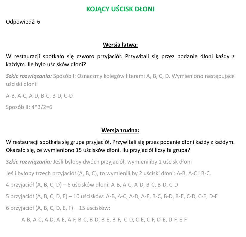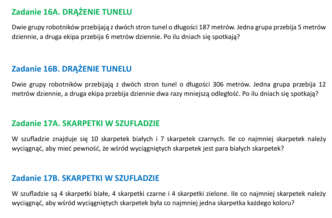 Zapraszam na matematyczny maraton zadań krótkiej odpowiedzi. Uczniowie podzieleni na grupy rozwiązują zadania logiczne i matematyczne, zaczynając od puli pięciu zadań. Brana pod uwagę jest tylko poprawna odpowiedź. Po podaniu poprawnej odpowiedzi grupa otrzymuje kolejne zadanie, a w przypadku odpowiedzi błędnej - szuka błędu i ma możliwość ponownego podejścia. Wygrywa drużyna, która w określonym czasie rozwiąże poprawnie największą liczbę zadań. Maraton składa się z 25 zadań, każde w wersji łatwej i trudnej (łącznie 50 zadań), co pozwala na modyfikowanie poziomu trudności i dostosowanie go do danej grupy / klasy.
