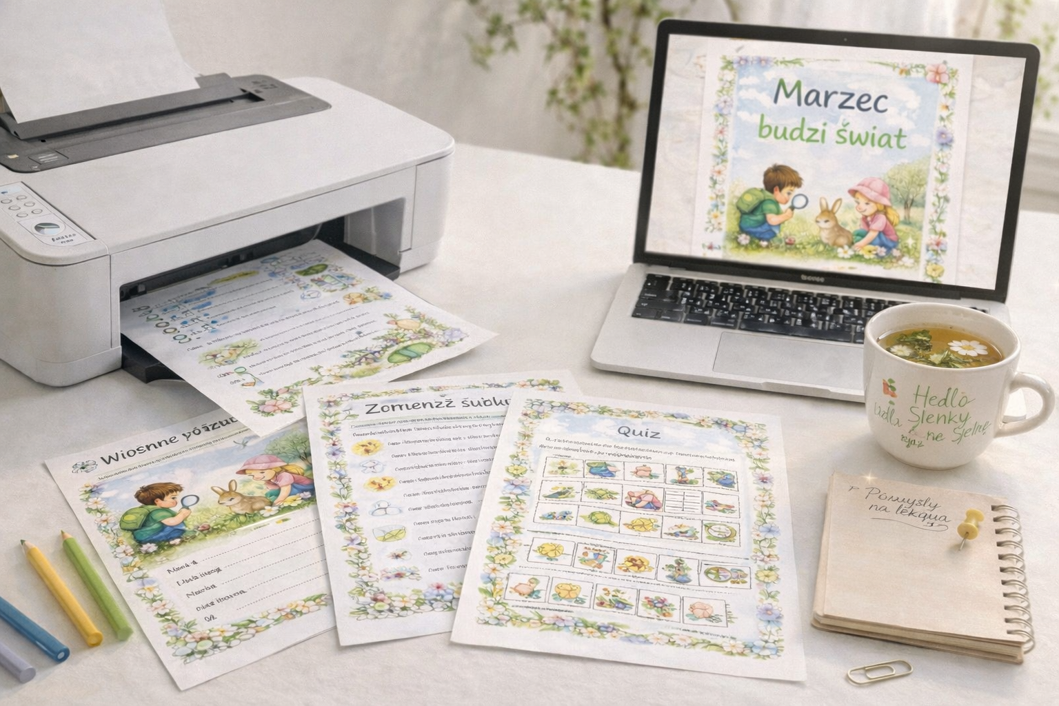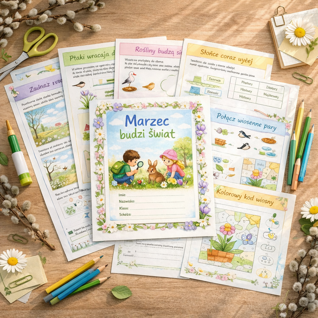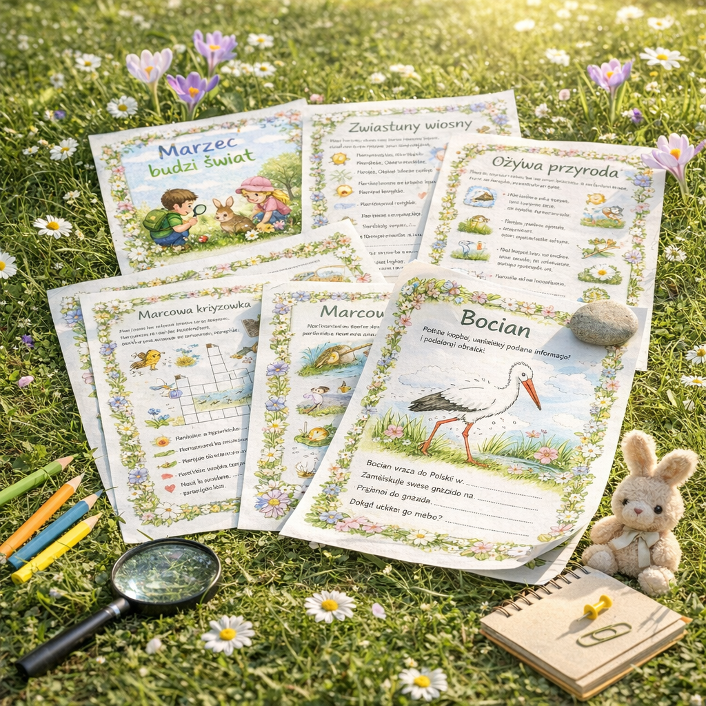Zestaw „Marzec budzi świat” to 6 pięknie opracowanych, kolorowych stron PDF, które zabiorą Twoich uczniów w pełną radości podróż po wiosennych zjawiskach przyrodniczych.