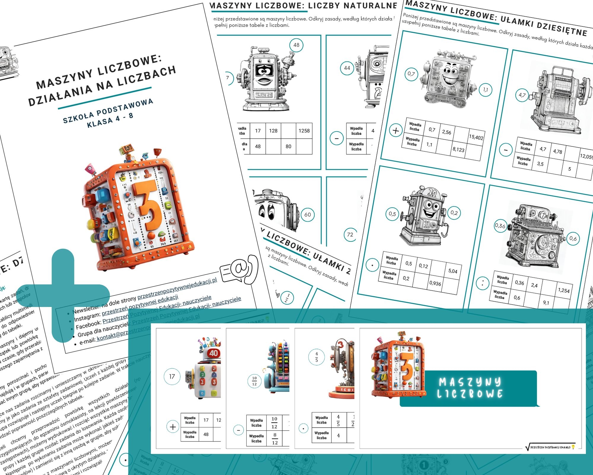 Maszyny liczbowe to aż 6 różnych kart pracy, w których trzeba odgadnąć, jaką zasadę działania ma każda z maszyn, a następnie policzyć, jak zmienią się inne liczby. Maszyny wykonują działania na liczbach naturalnych, całkowitych, ułamkach zwykłych (2 wersje trudności) i ułamkach dziesiętnych (2 wersje trudności). Do kart pracy dołączyłyśmy aż 7 różnych sposobów pracy z zadaniami. Maszyny można pokolorować.