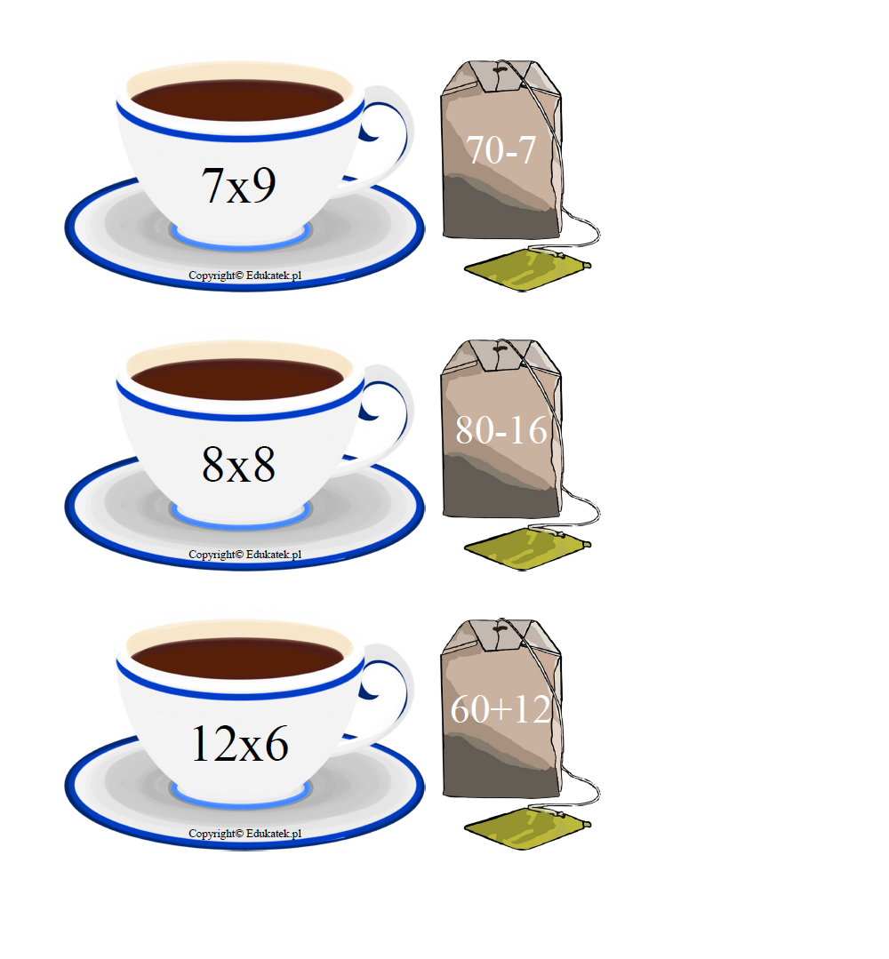 Filiżanki rozkładamy przed dziećmi. Nauczyciel lub wybrane dziecko losuje oraz odczytuje działanie umieszczone na herbatce. Zadaniem ucznia jest jak najszybsze przyporządkowanie herbatki do właściwej filiżanki.